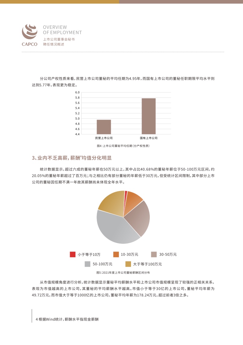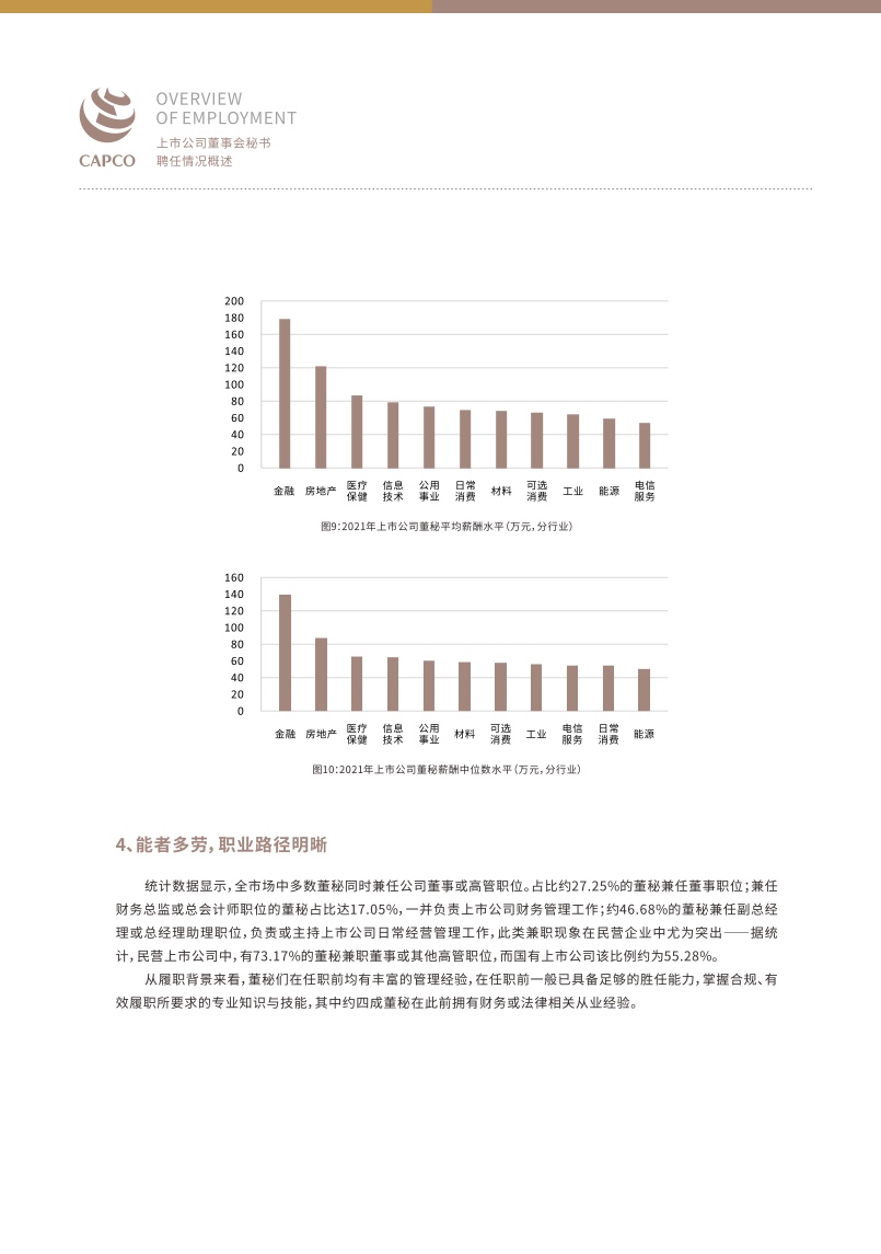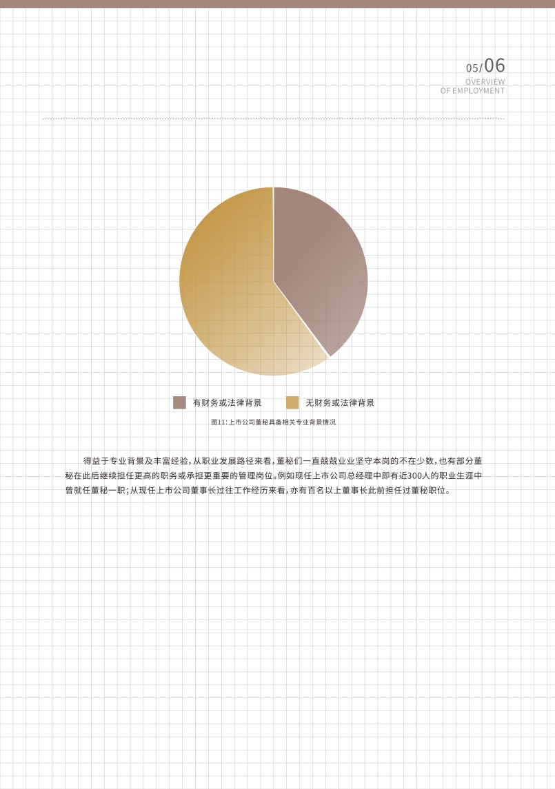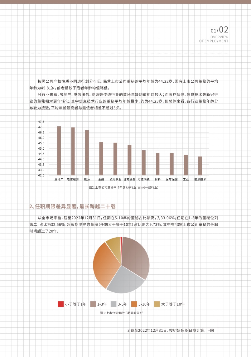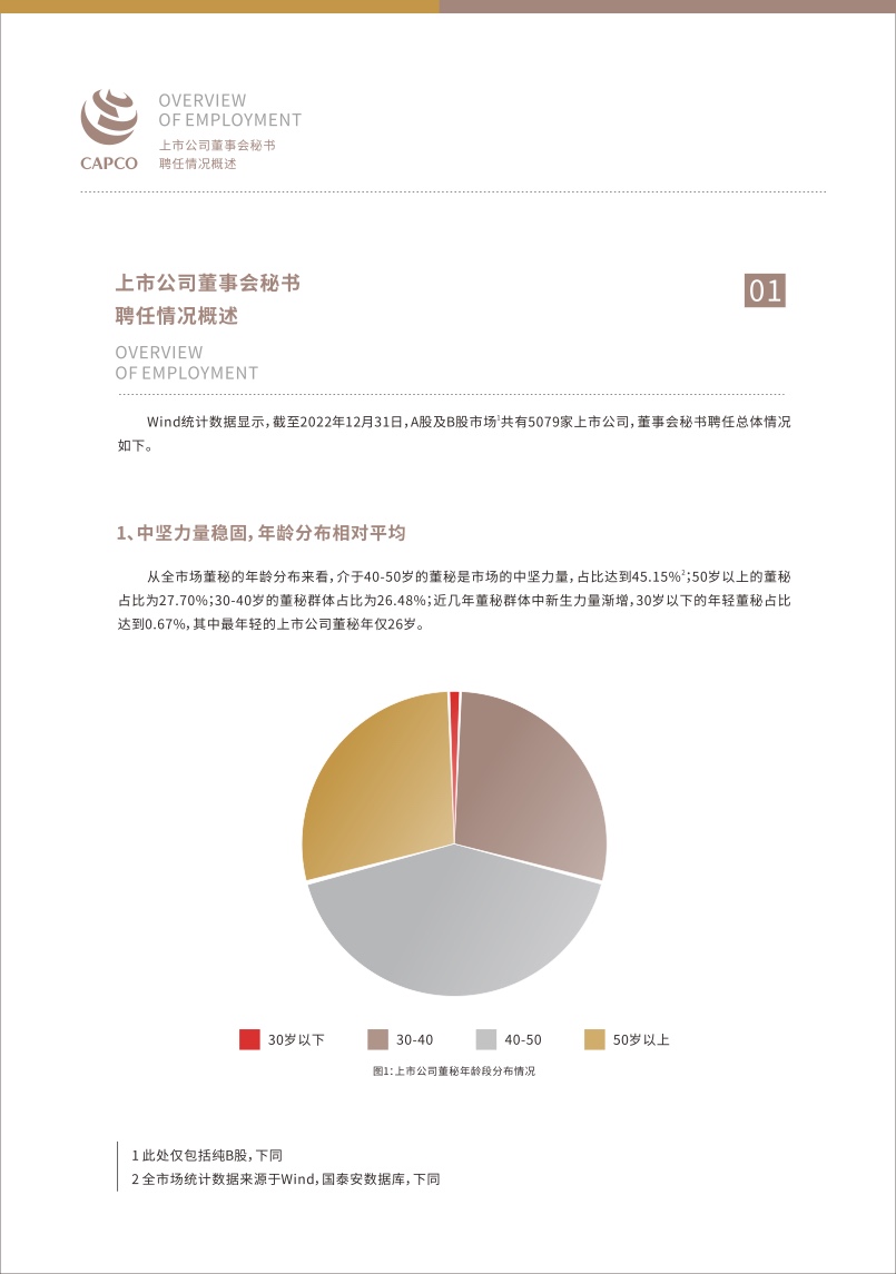 报告显示,截至2022年12月31日,A股及B股市场共有5079家上市公司,董事会秘书群体总体呈现以下几个特征。一是年龄分布相对平均,40-50岁的董秘是市场的中坚力量,近几年董秘群体中新生力量渐增,30岁以下的年轻董秘占比达到0.67%。民营企业董秘平均年龄略低于国有企业,医疗保健、信息技术等新兴行业的董秘平均年龄略低于能源、房地产等传统行业。二是任职期限差异显著,最长跨越20年,任期在5—10年的董秘占比最高,为33.06%;任期在1—3年的董秘位列第二,占比为32.56%。超长期坚守的董秘(任期大于等于10年)占比则为9.73%,其中有43家上市公司董秘的任职时间超过了20年。三是董秘职业路径明晰,多数董秘同时兼任公司董事或其他高管职位,在任职前均有丰富的管理经验,一般已具备足够的胜任能力,掌握合规、有效履职所要求的专业知识与技能,其中约四成董秘在此前拥有财务或法律相关从业经验。