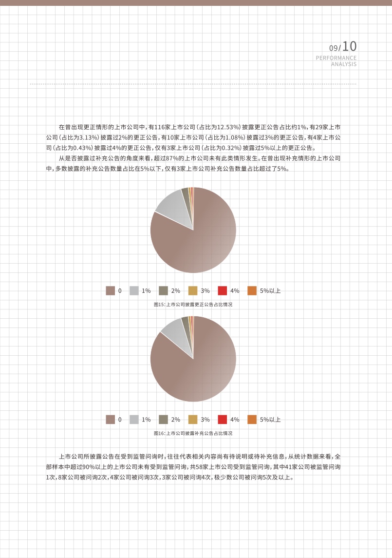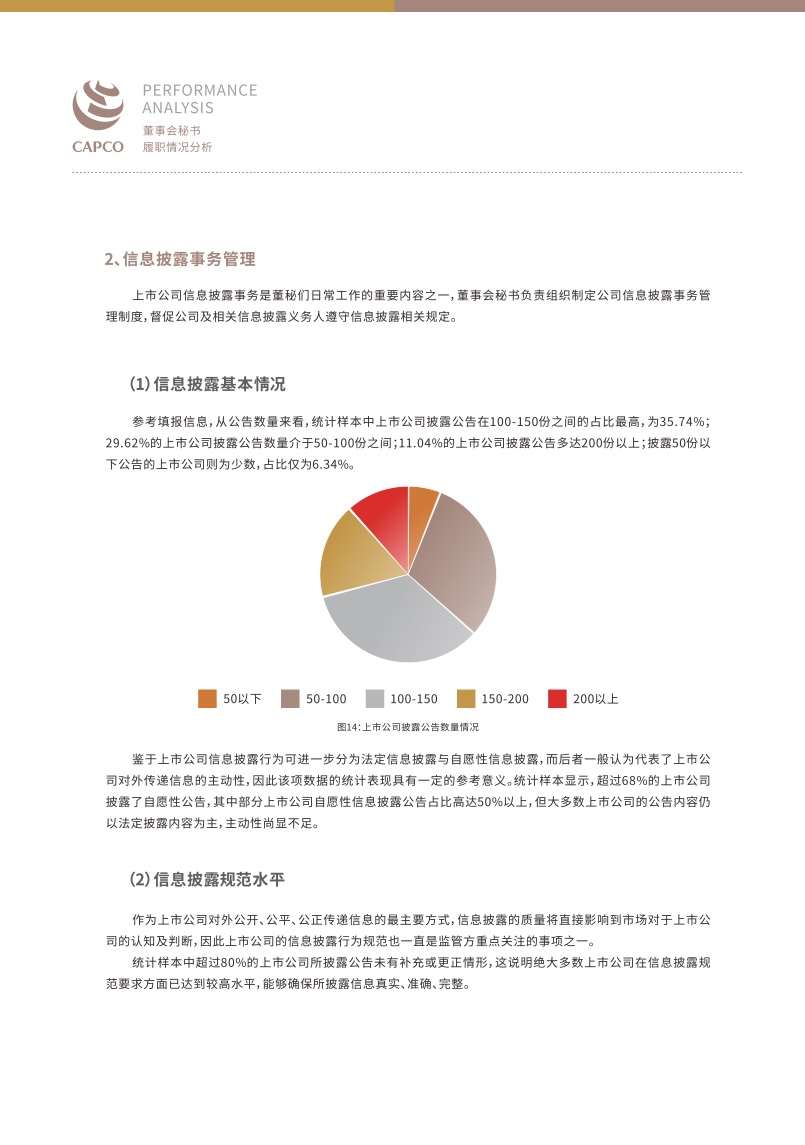 在信息披露事务管理方面,从公告数量来看,统计样本中上市公司披露公告在100-150份之间的占比最高,为 35.74%;29.62%的上市公司披露公告数量介于50-100份之间;11.04%的上市公司披露公告多达200份以上;披露50份以下公告的上市公司则为少数,占比仅为6.34%。超过80%的上市公司所披露公告未有补充或更正情形,说明绝大多数上市公司在信息披露规范要求方面已达到较高水平,能够确保所披露信息真实、准确、完整;有超过700家公司(占比为77.11%)采用了以一图读懂年报、视频音频等可视化形式强化临时公告和定期报告的宣传与解读,提升了投资者的公告阅读体验,以加强投资者对公司的了解。