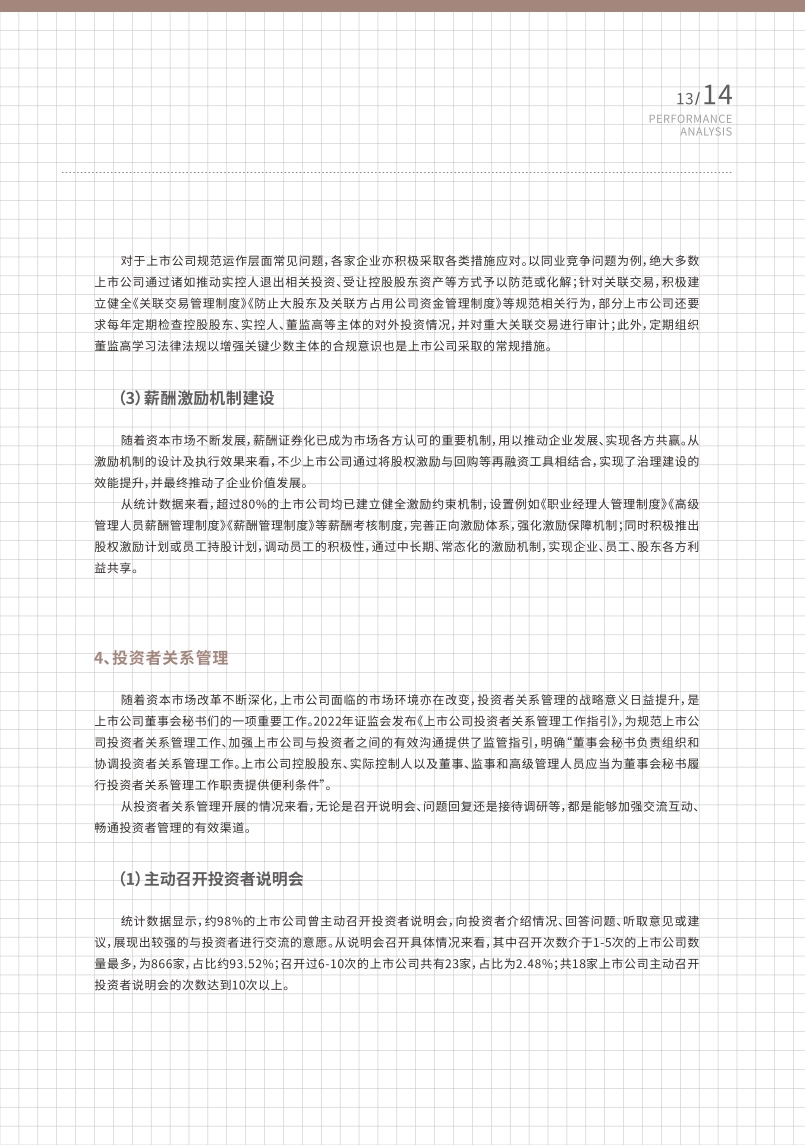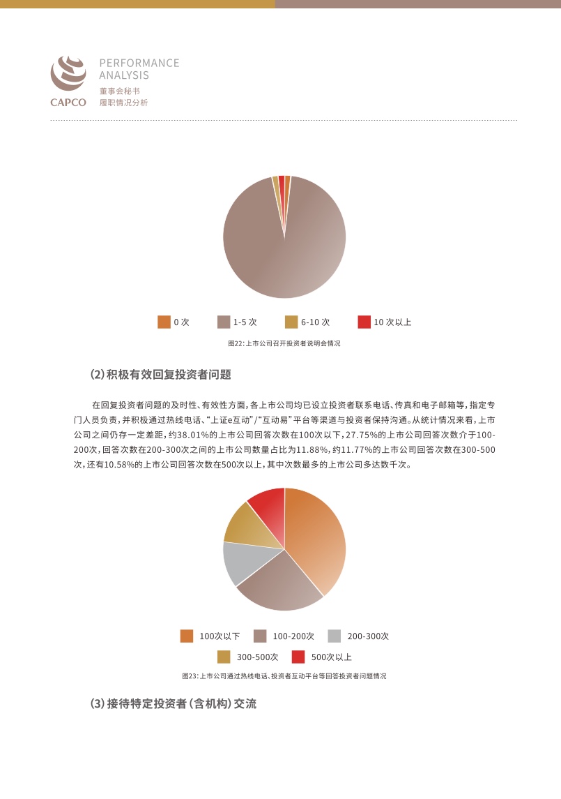 投资者关系管理方面,无论是召开说明会、问题回复还是接待调研等,都是能够加强交流互动、畅通投资者管理的有效渠道。样本中,约98%的上市公司曾主动召开投资者说明会,向投资者介绍情况、回答问题、听取意见或建议,展现出较强的与投资者进行交流的意愿。