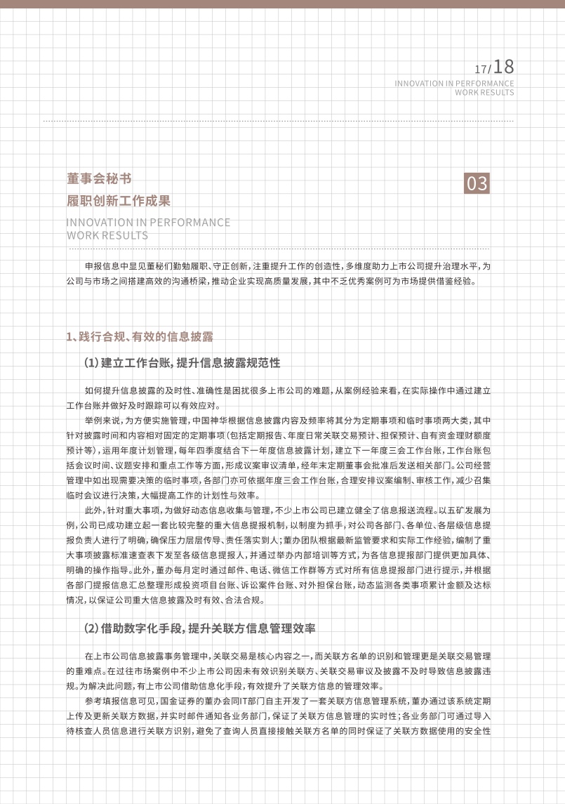 上市公司董事会秘书不仅在基本工作职责中做到勤勉履职,同时十分注重提升工作的创造性,守正创新,多维度助力上市公司提升治理水平,为公司与市场之间搭建高效的沟通桥梁,推动企业实现高质量发展。报告提到,董事会秘书在践行合规有效的信息披露、构建高效治理运行机制、提升投资者关系管理水平、深入贯彻社会责任理念等方面做了大量有亮点、创新性的工作。