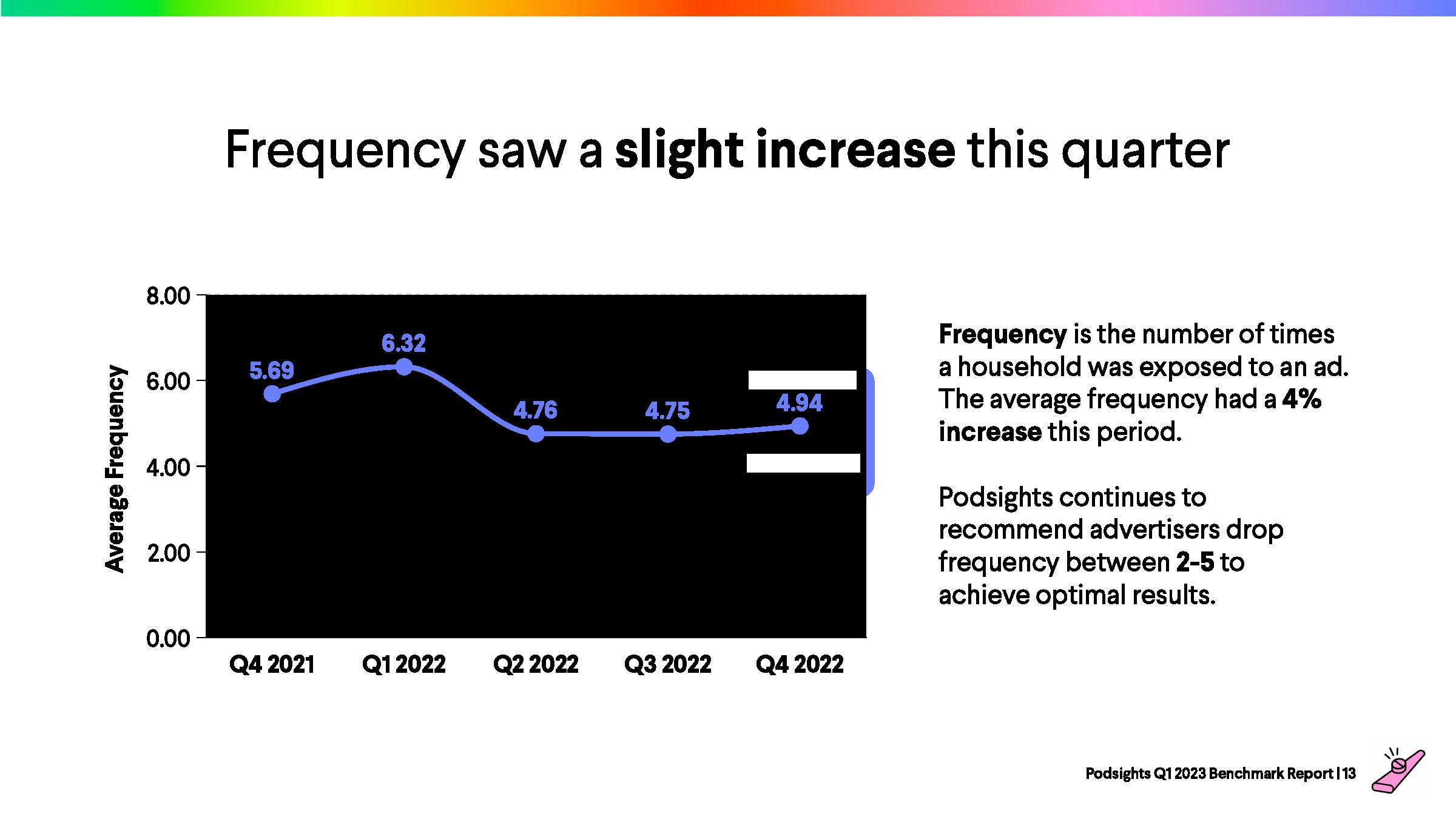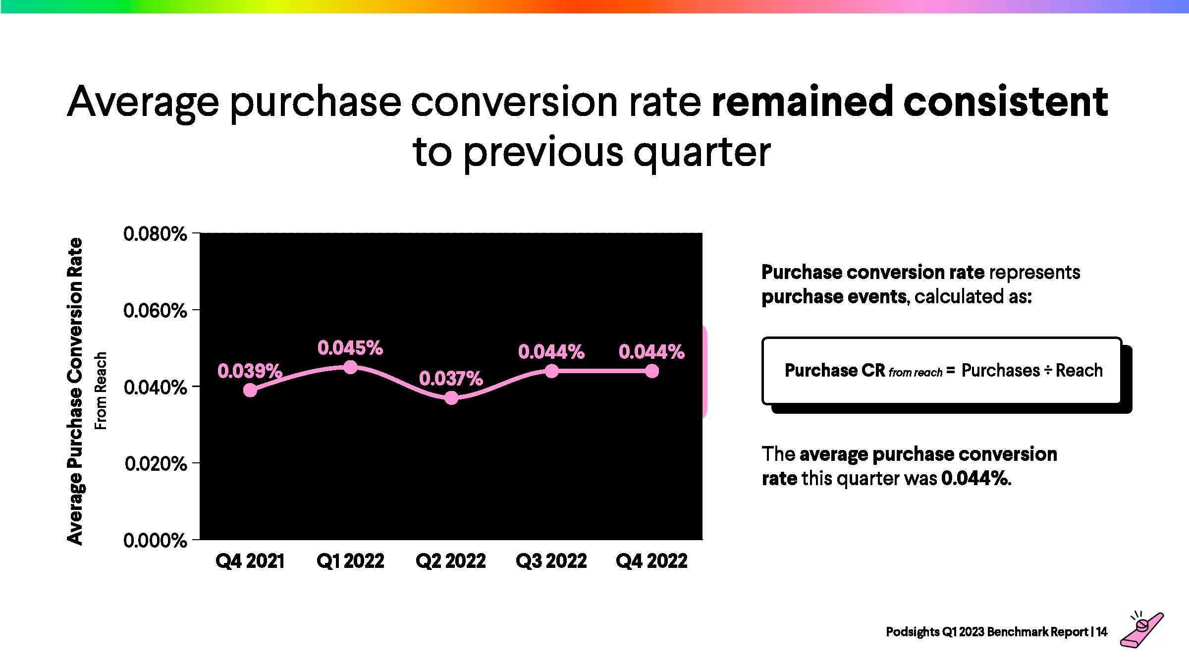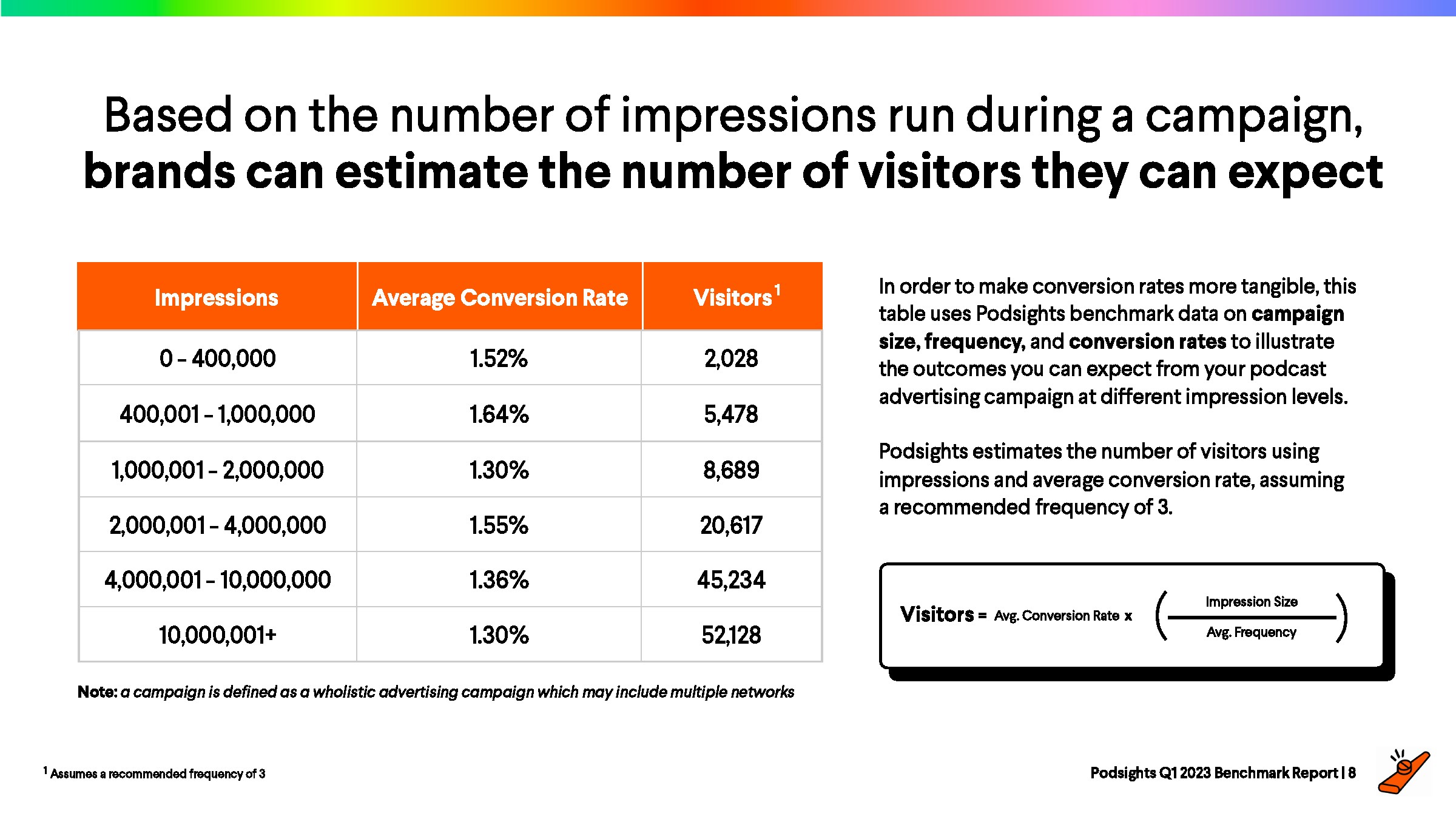 为了提高转化率,报告使用了Podsights关于活动规模、频率和转化率的基准数据,可以说明在不同展现水平下从播客广告活动中获得的效果。