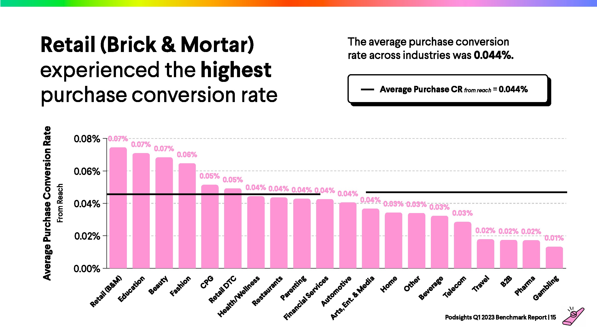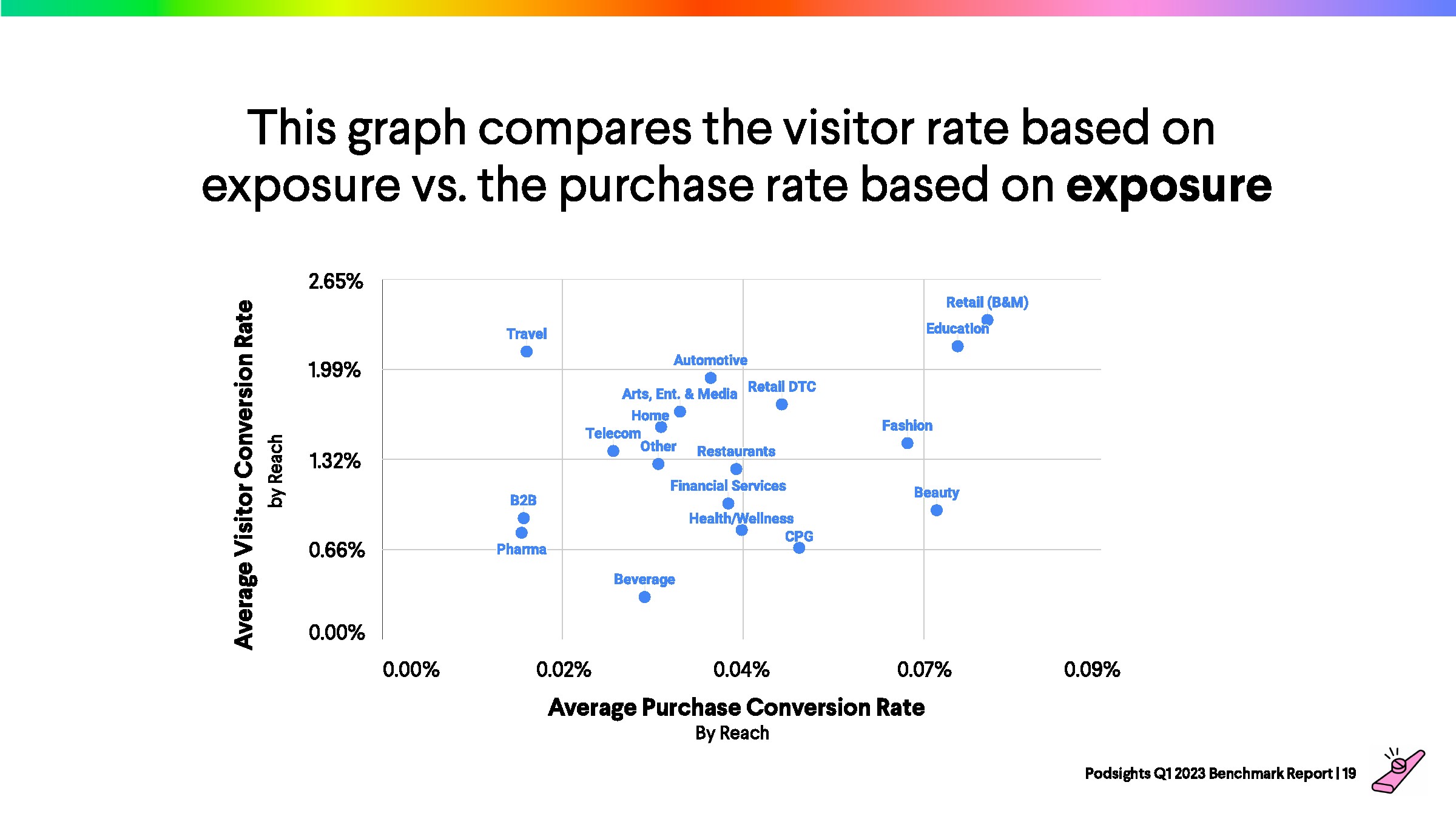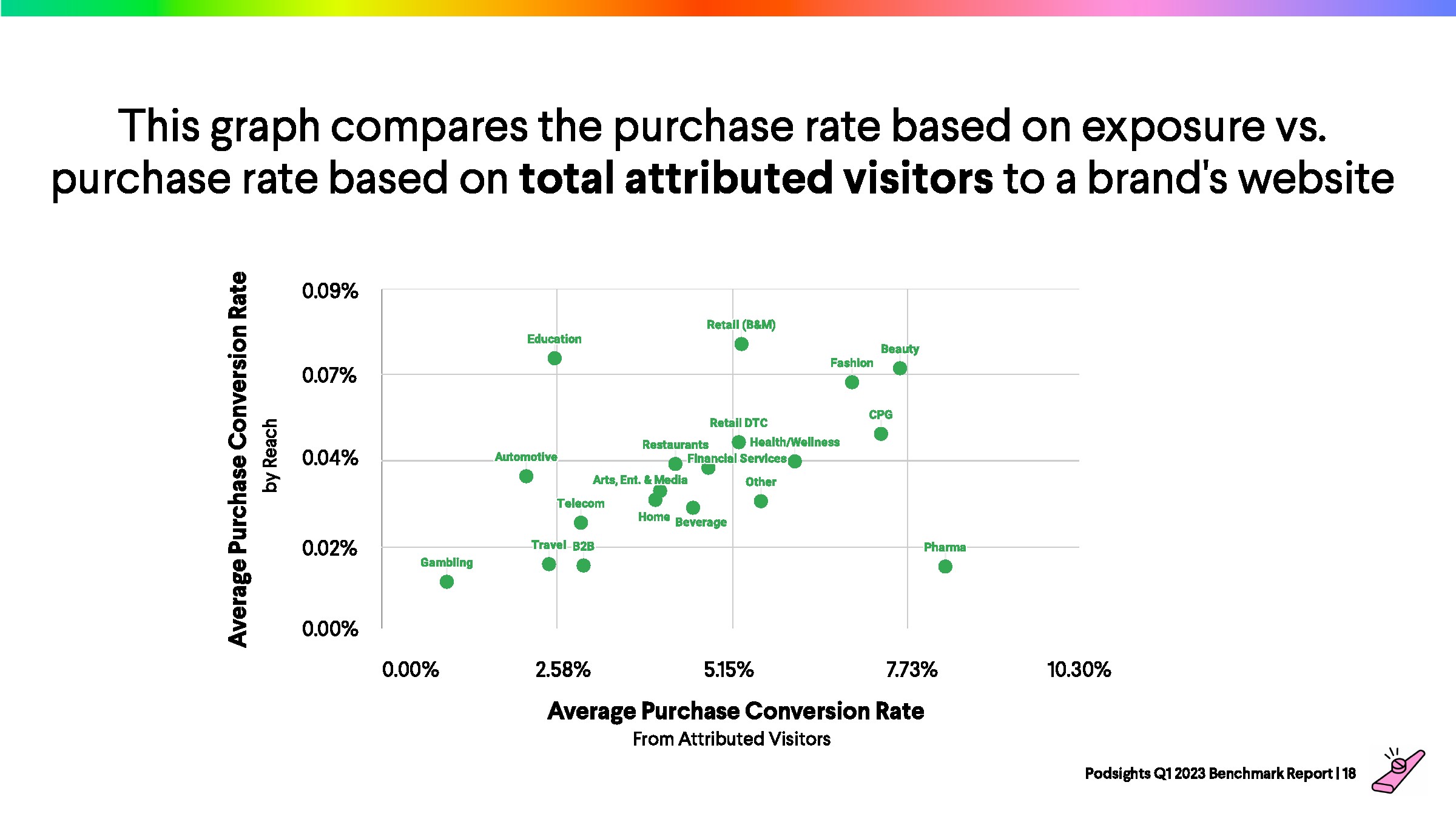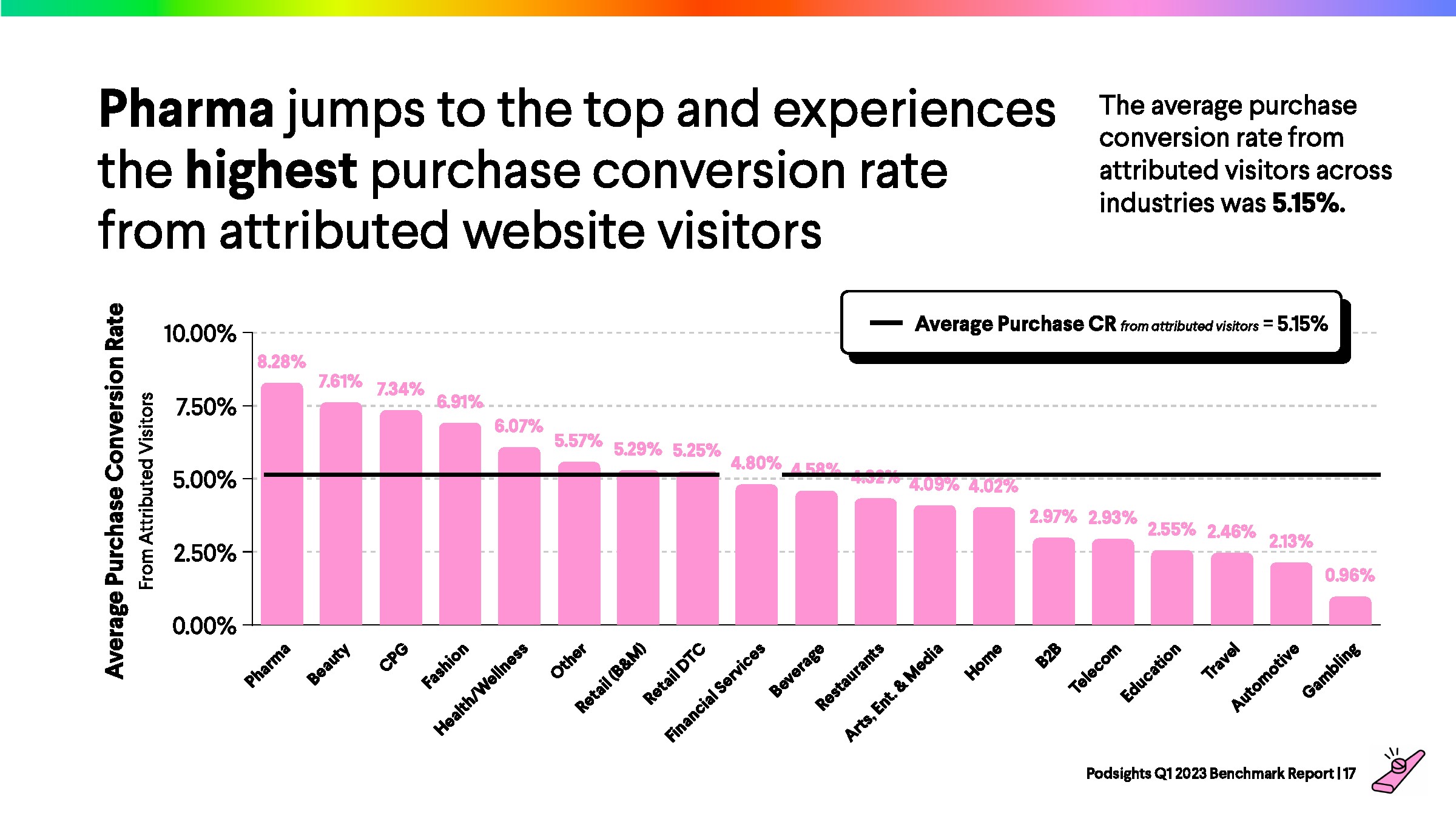 归因访问者的转化率描述了由于播客广告访问网站的家庭购买率,平均购买转化率增长了7%至5.15%。制药业归因访客购买转化率最高,为8.28%。紧随其后的是美容和CPG。
