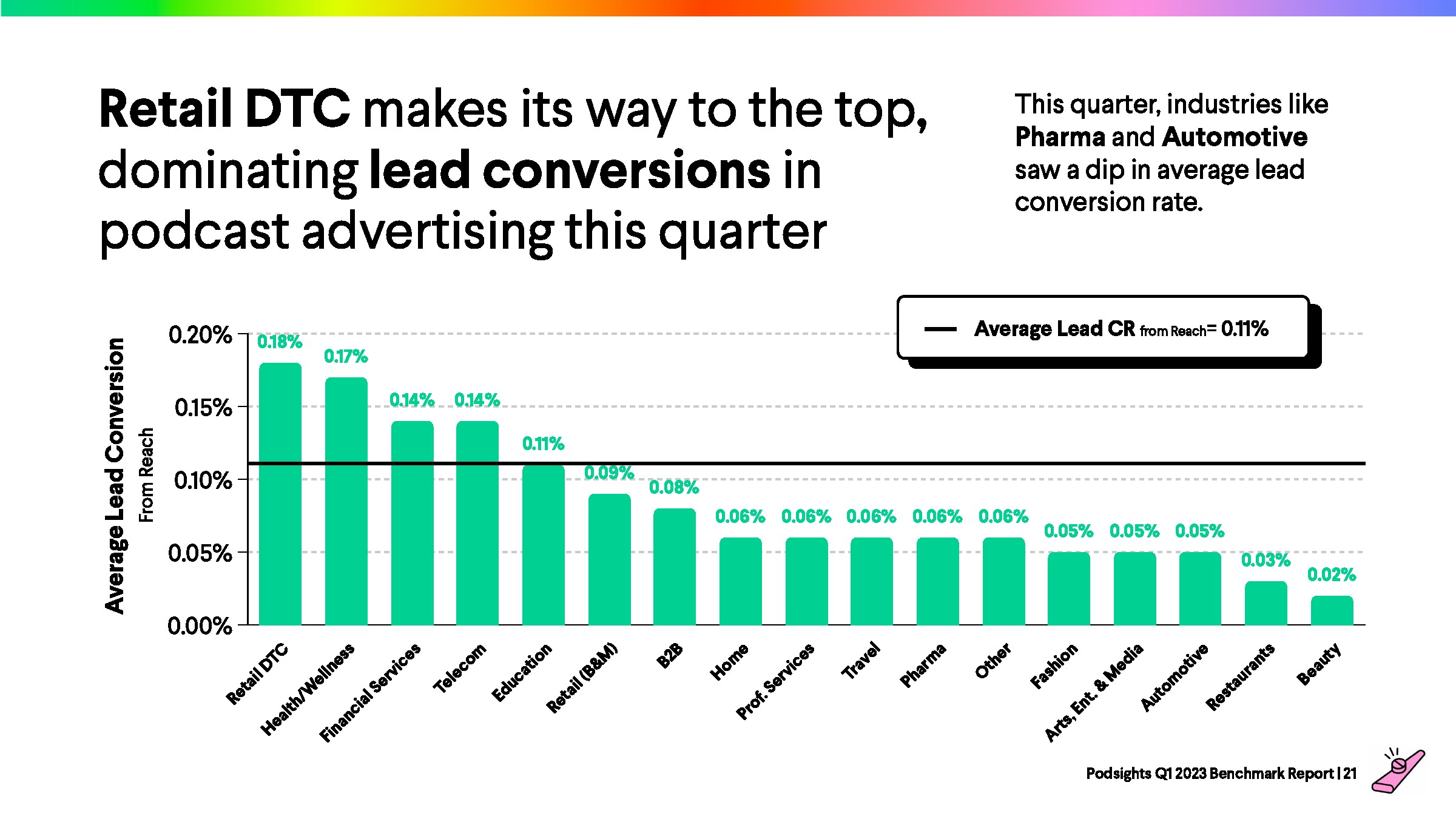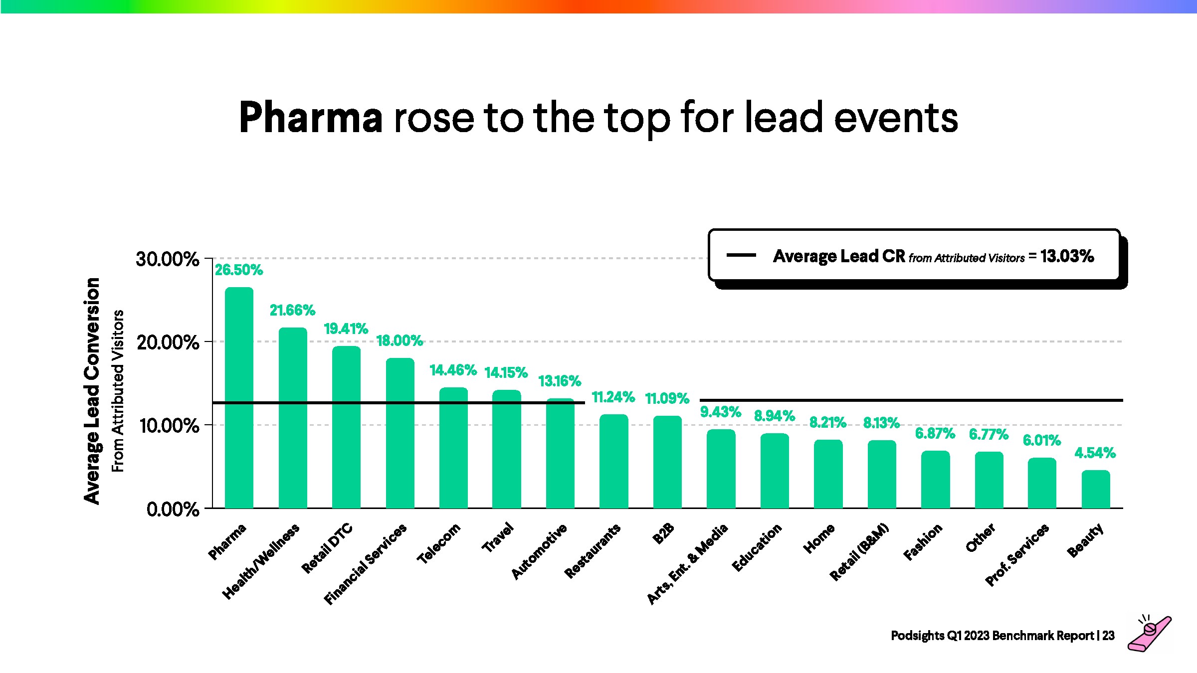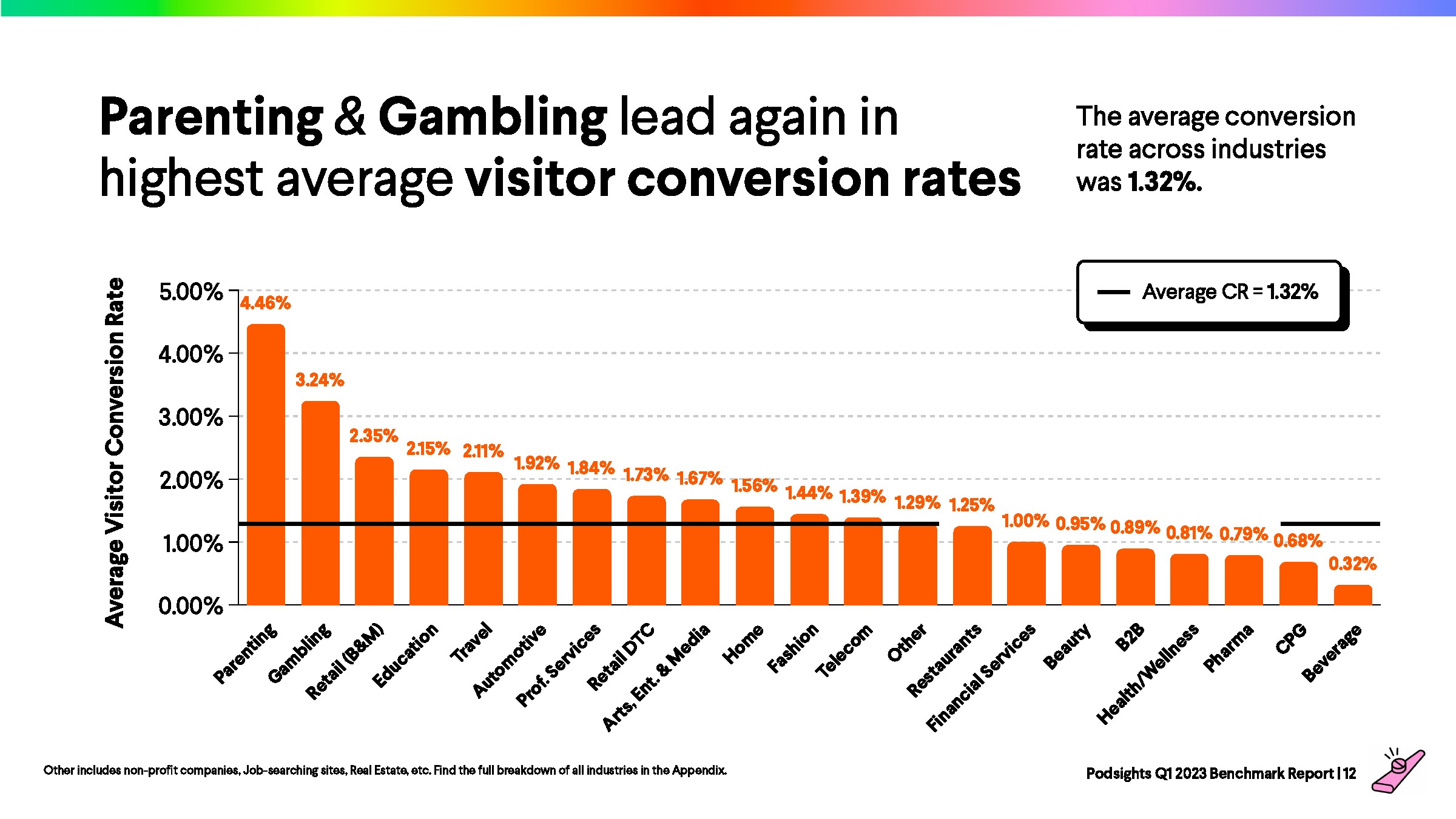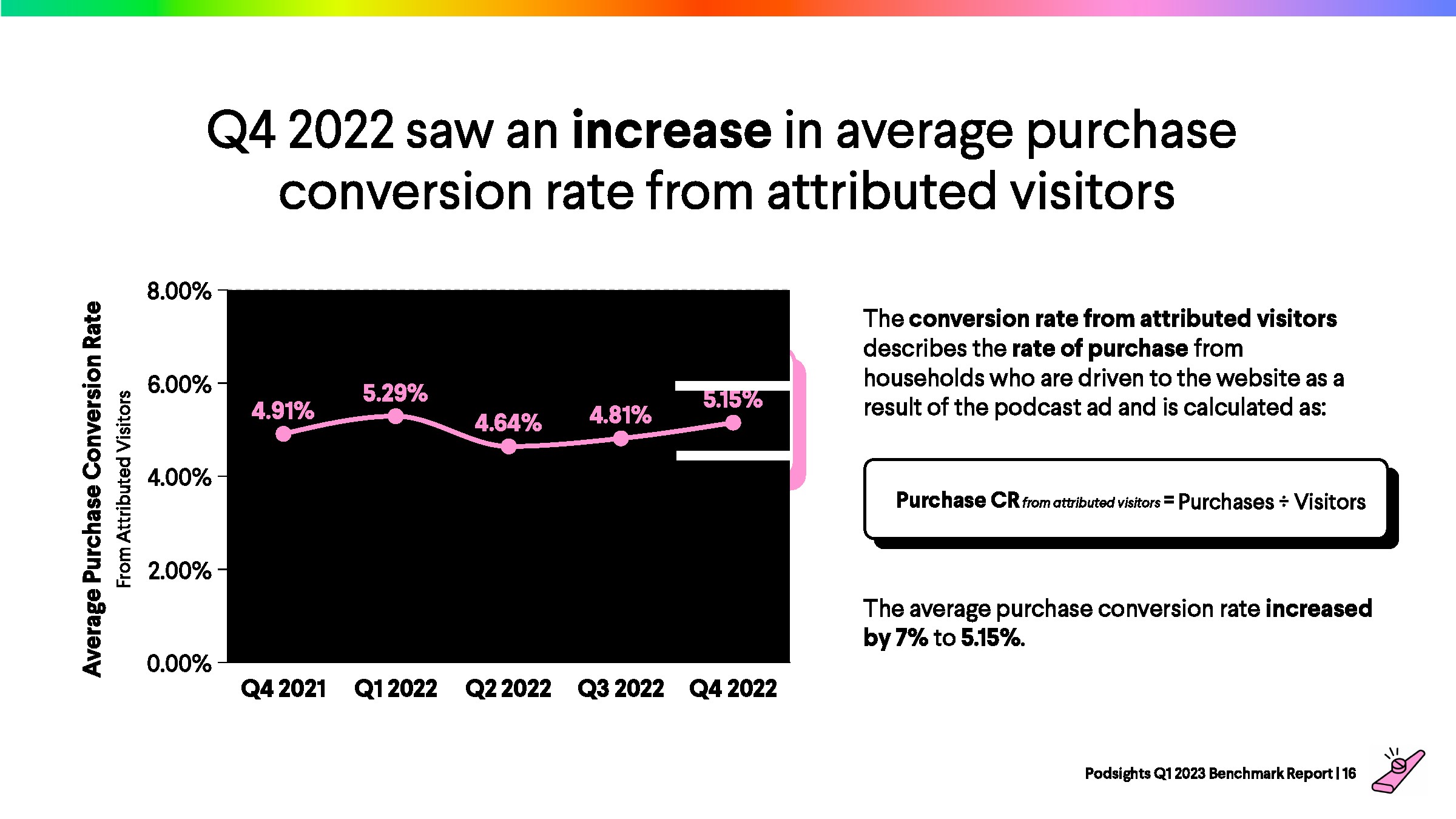 归因访问者的转化率描述了由于播客广告访问网站的家庭购买率,平均购买转化率增长了7%至5.15%。制药业归因访客购买转化率最高,为8.28%。紧随其后的是美容和CPG。