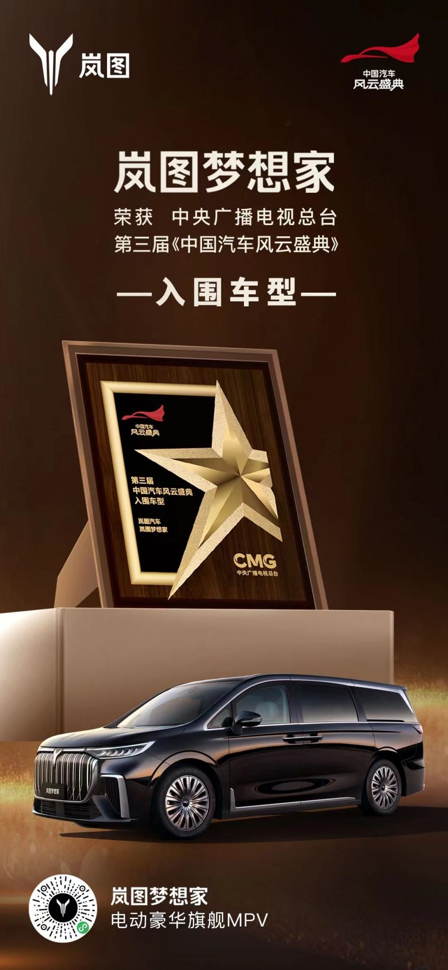 2月24日,在中央广播电视总台主办的第三届《中国汽车风云盛典》入围发布仪式上,岚图梦想家凭借超越同级的驾控体验和全方位的极致安全入围此次评选。这也是岚图汽车两年蝉联《中国汽车风云盛典》入围车型。
