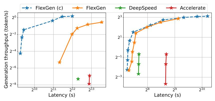 图 1. OPT-175B(左)和 OPT-30B(右)上三个基于 offloading 的系统的延迟和吞吐量权衡。FlexGen 实现了新的帕累托最优边界,OPT-175B 的最大吞吐量提高了 100 倍。由于内存不足,其他系统无法进一步提高吞吐量。