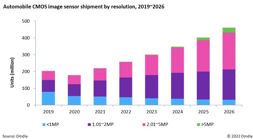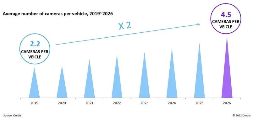 摄像头是当今智能汽车最不可或缺的传感器。它的分辨率高,通过深度神经网络学习进行模型标定、目标跟踪和障碍物识别,可用于车外的道路环境感知和车内驾驶员和乘客的监控。汽车制造商们广泛使用视觉感知方案来实现Level 2及以上的辅助驾驶功能,如前方碰撞警告(FCW)、车道偏离警告(LDW)、自适应巡航控制(ACC)和自主紧急制动(AEB)等。近些年,ADAS(高级辅助驾驶)装机率的提高带动了单车搭载的摄像头的数目不断增加。例如,特斯拉为其自动驾驶硬件系统配备了8个摄像头,蔚来的ET7安装了11个摄像头之多。2019年,全球每部汽车安装的摄像头数目平均只有2.2个,但Omdia预计到2026年这个数字将翻倍。
