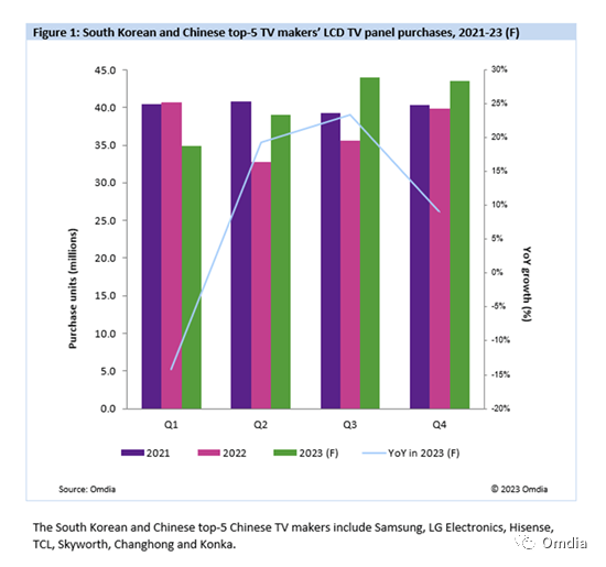 鉴于强劲的市场需求前景,三星电子和 LG 电子已开始提前规划 2023 年的采购体量,2023 年面板需求可能会从 2022 年的 14 年低点年同比激增 22%。