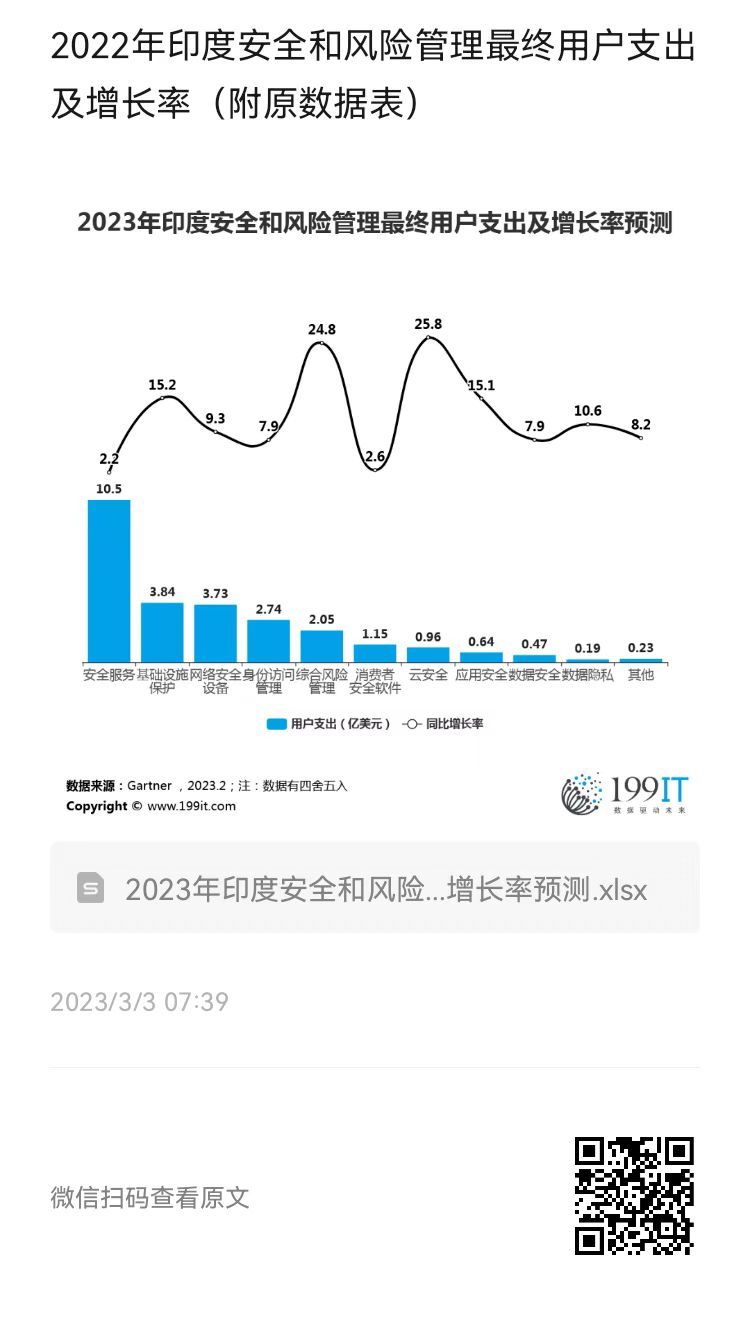 - 2023年印度安全和风险管理最终用户支出及增长率预测