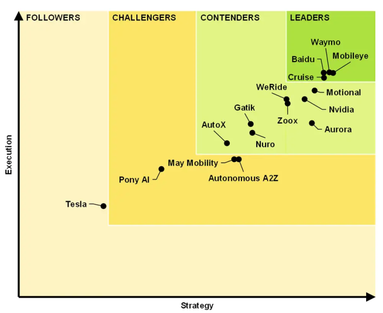 具体来看,领导者包括 Mobileye、Waymo、百度和 Cruise。大部分公司都集中在竞争者这一层级,其中包括Motional、英伟达、Aurora、文远知行、Zoox、Gatik、Nuro和安途。