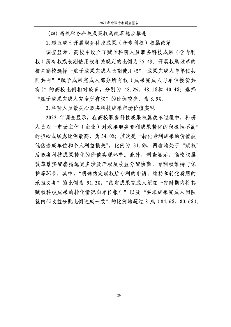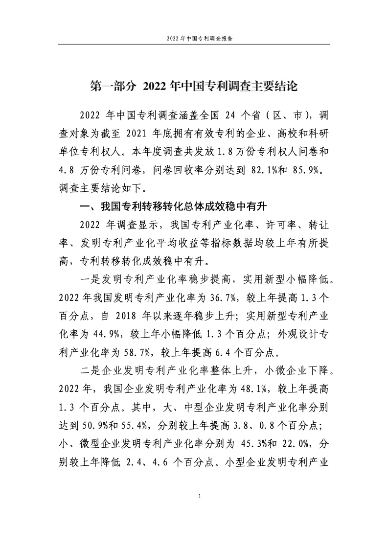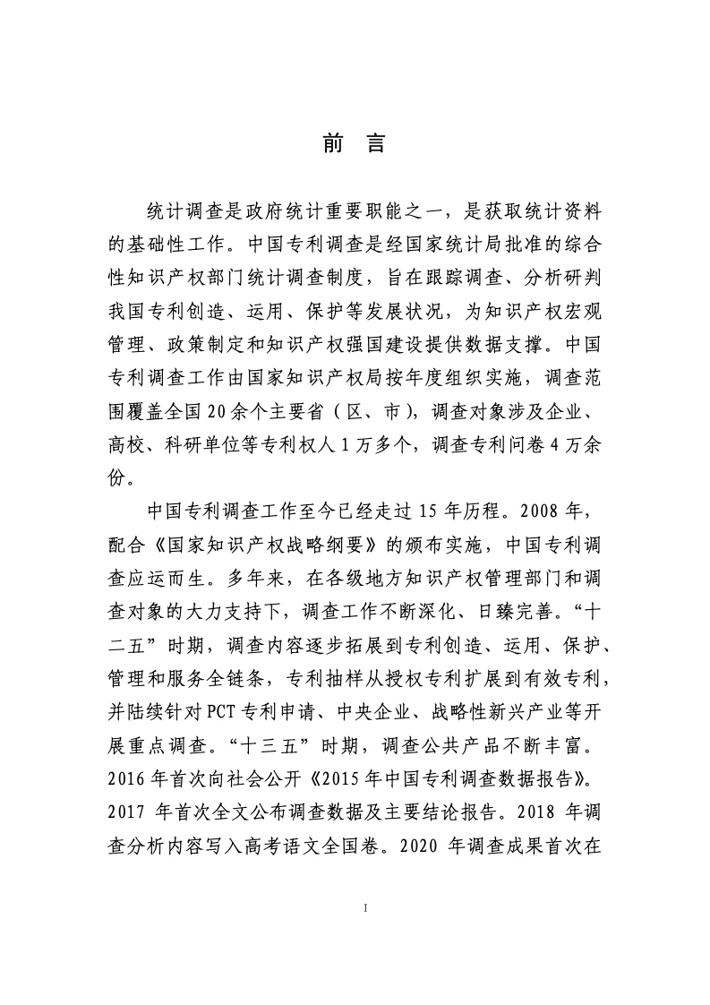 中国专利调查是经国家统计局批准的部门统计调查制度,旨在调查分析我国专利创造、保护、运用状况。调查工作迄今已连续开展15年,调查显示,我国专利转移转化总体成效稳中有升,知识产权保护环境持续优化。