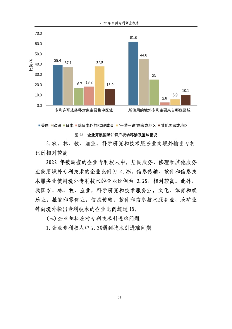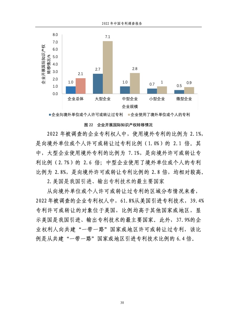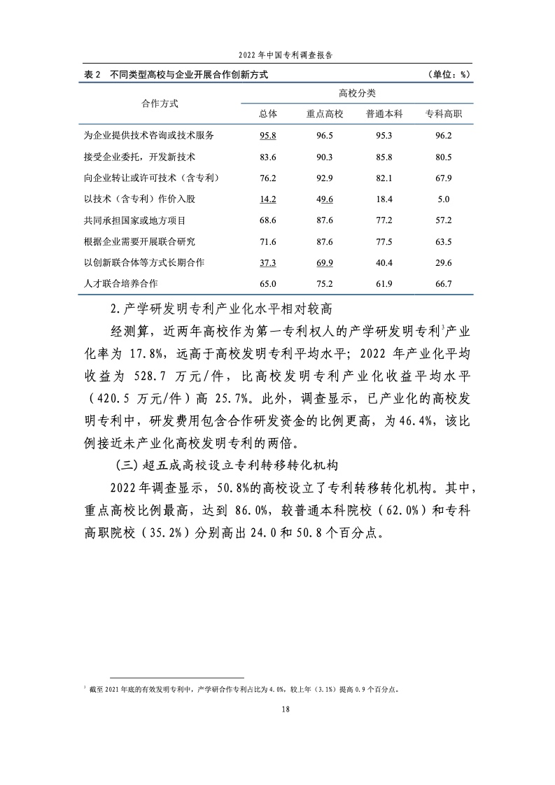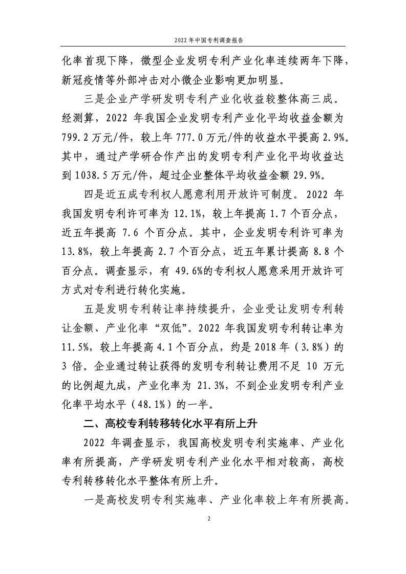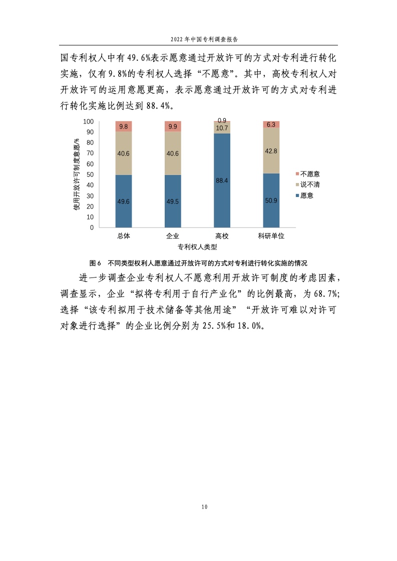 我国有效发明专利许可率为12.1%,较上年提高1.7个百分点,近五年持续上升。针对专利开放许可的调查显示,48.3%的专利权人知晓开放许可制度,有49.6%的专利权人愿意采用开放许可方式,其中高校专利权人这一比例达到9成。开放许可促进专利转移转化的制度作用正逐步显现。