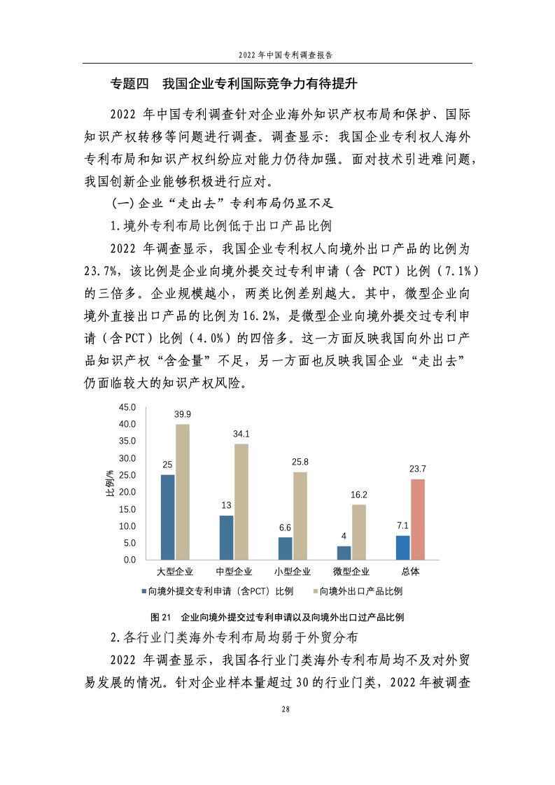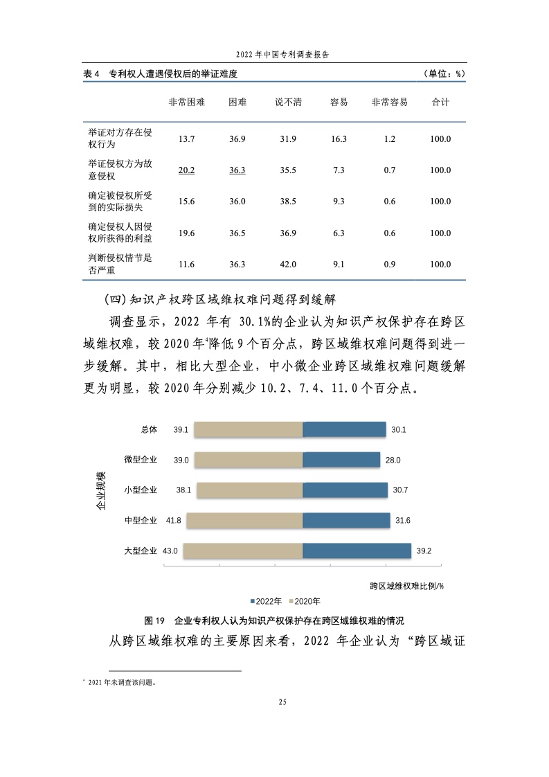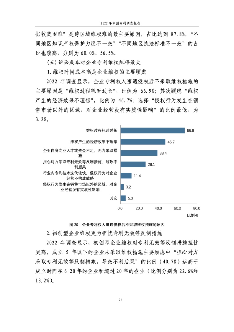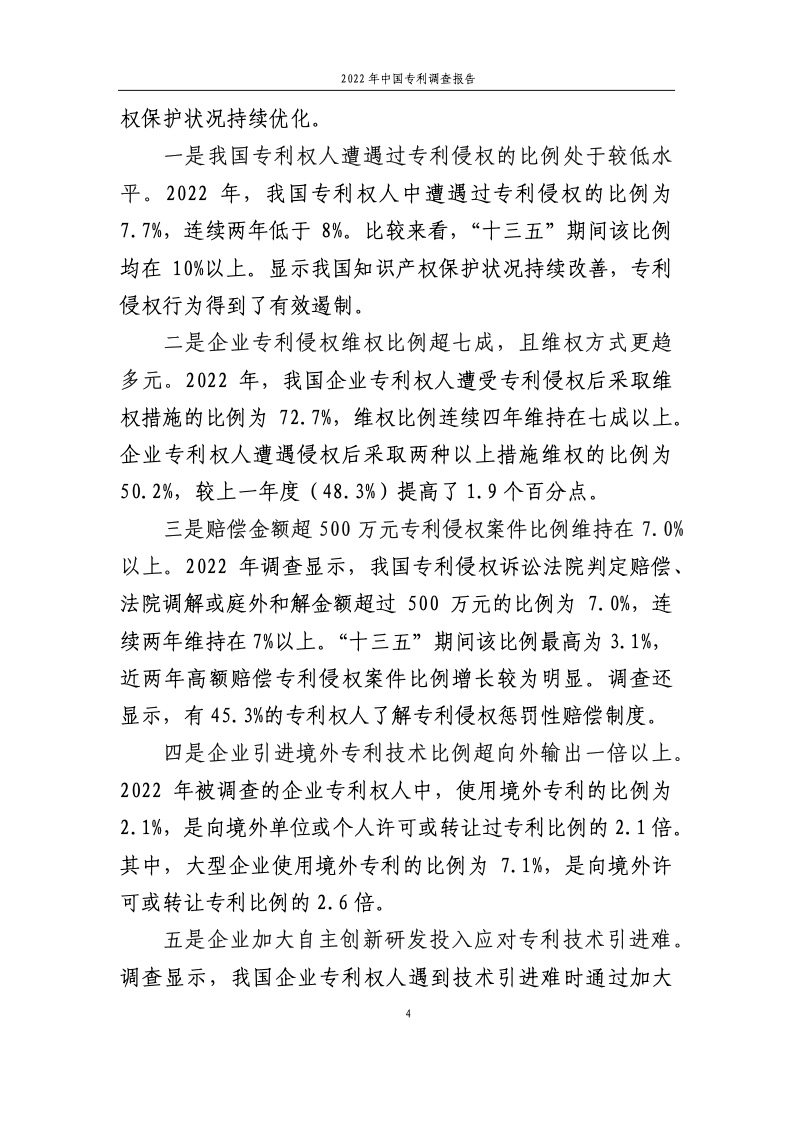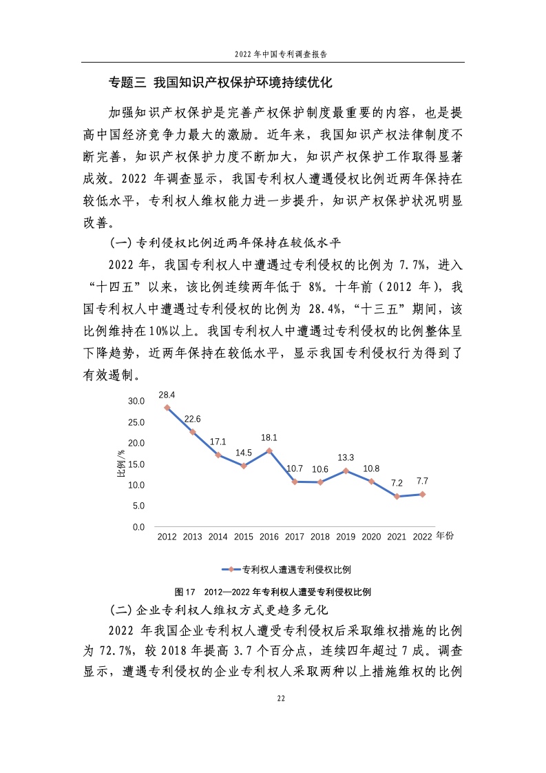 2022年,我国专利权人中遭遇过专利侵权的比例为7.7%,连续两年低于8%,这一比例低于“十三五”期间10%以上的比例,更是显著低于“十二五”期间最高28.4%的比例。这显示随着我国知识产权保护状况持续改善,专利侵权行为得到了有效遏制。