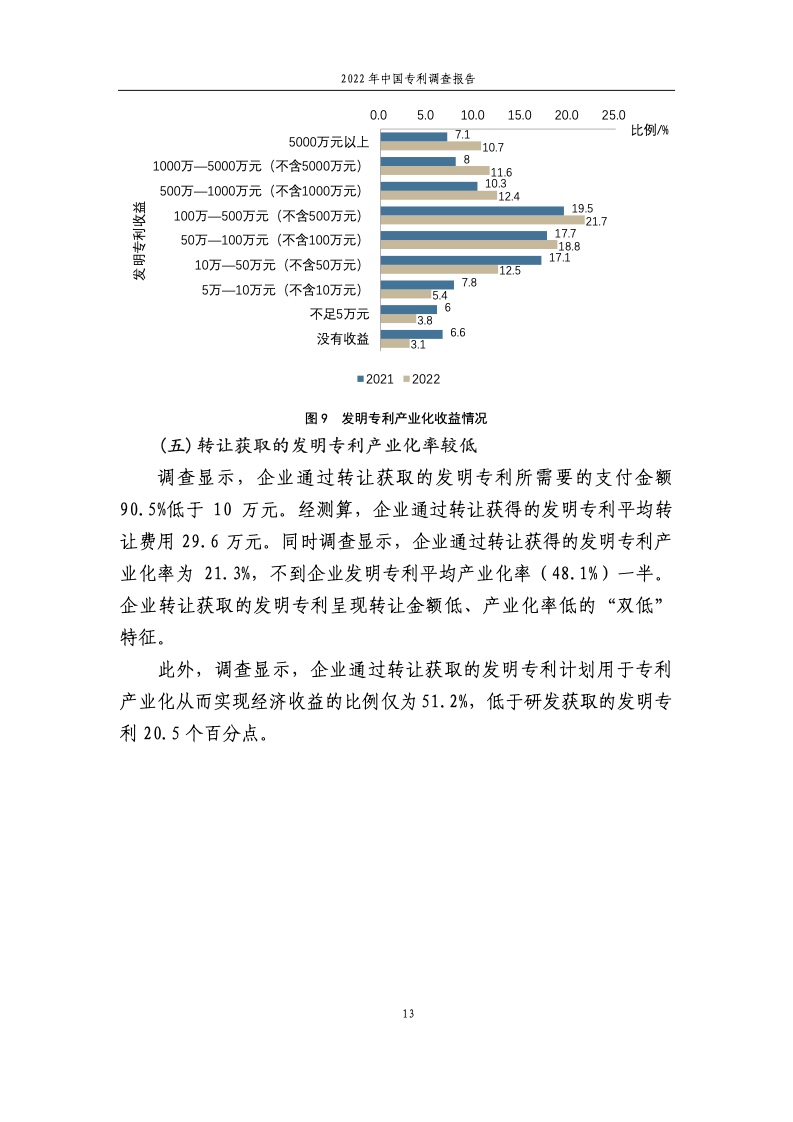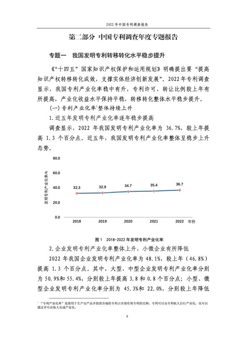 2022年我国有效发明专利产业化率为36.7%,较上年提高1.3个百分点。其中,企业发明专利产业化率为48.1%,较上年提高1.3个百分点,较2018年提高3.1个百分点。