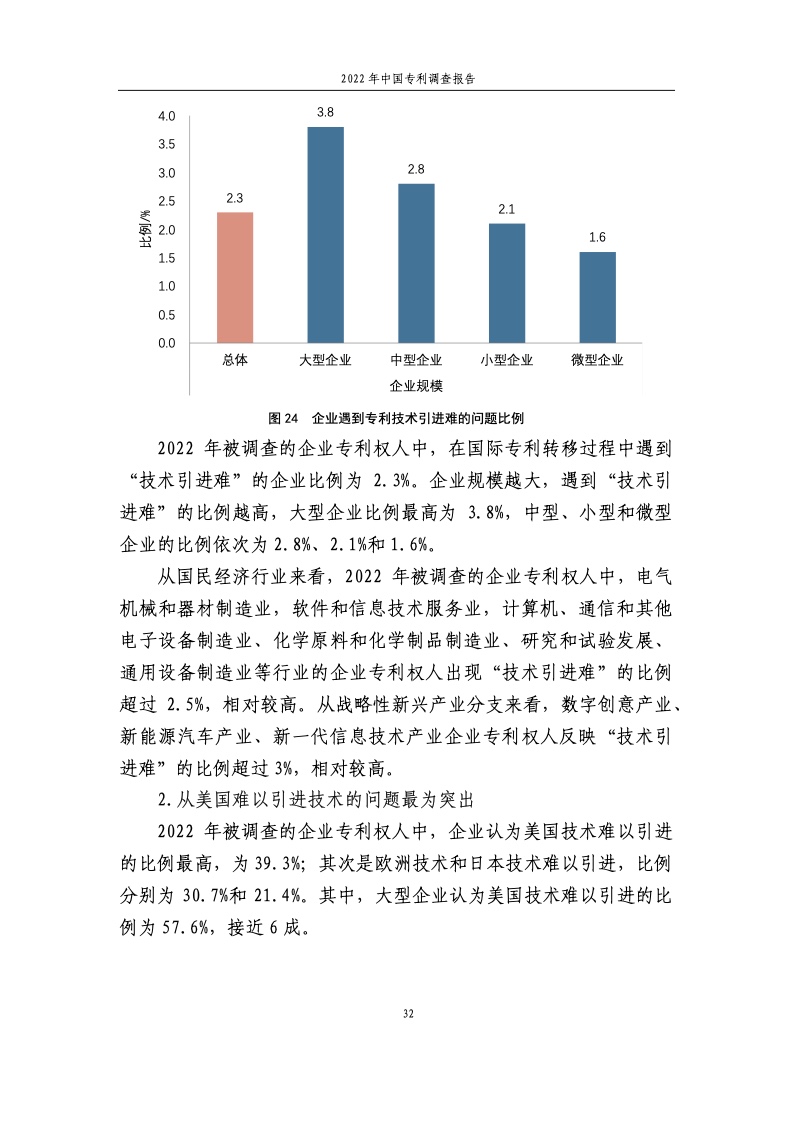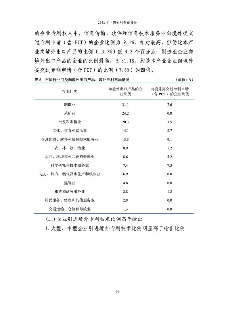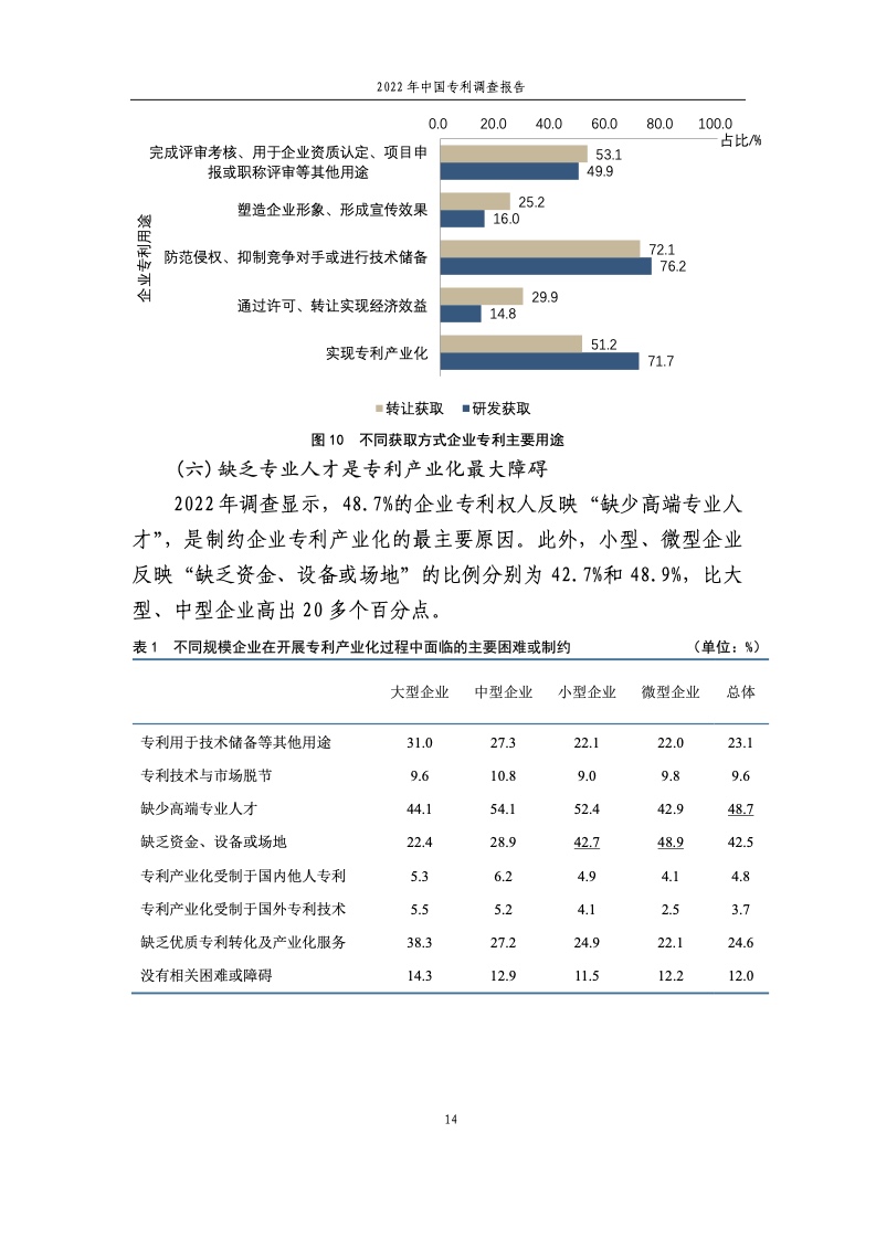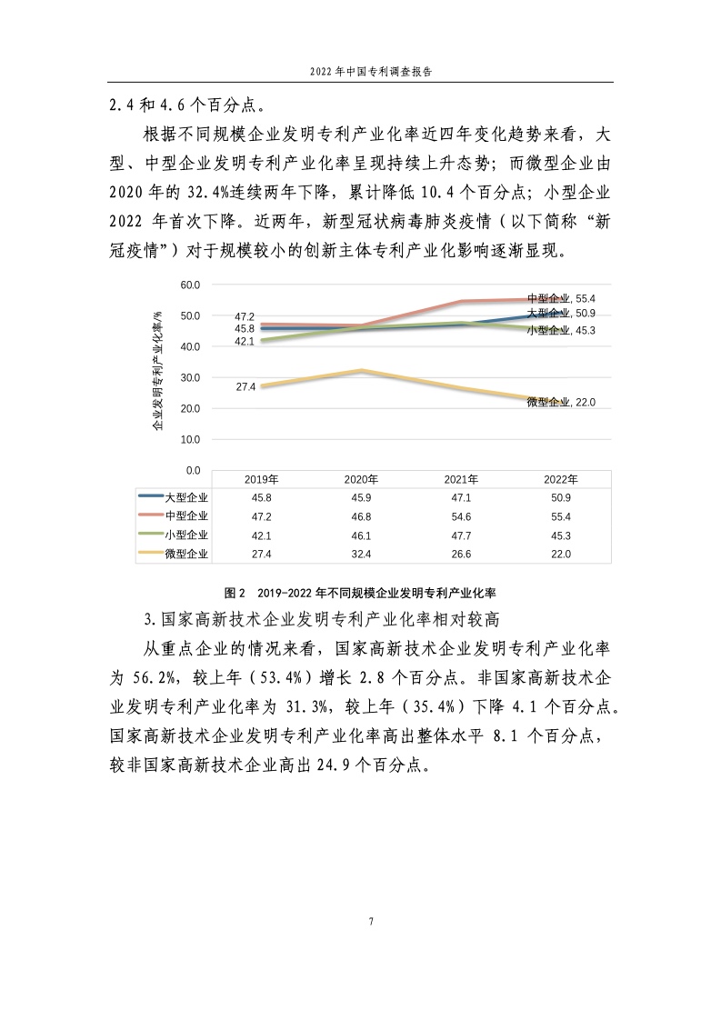 2022年,国内大、中型企业发明专利产业化率分别为50.9%和55.4%,分别较上年提高3.8和0.8个百分点。国内龙头企业专利转移转化能力较强,带动我国发明专利产业化率不断提高。