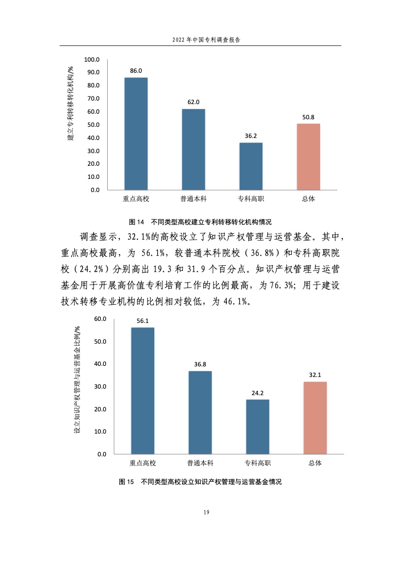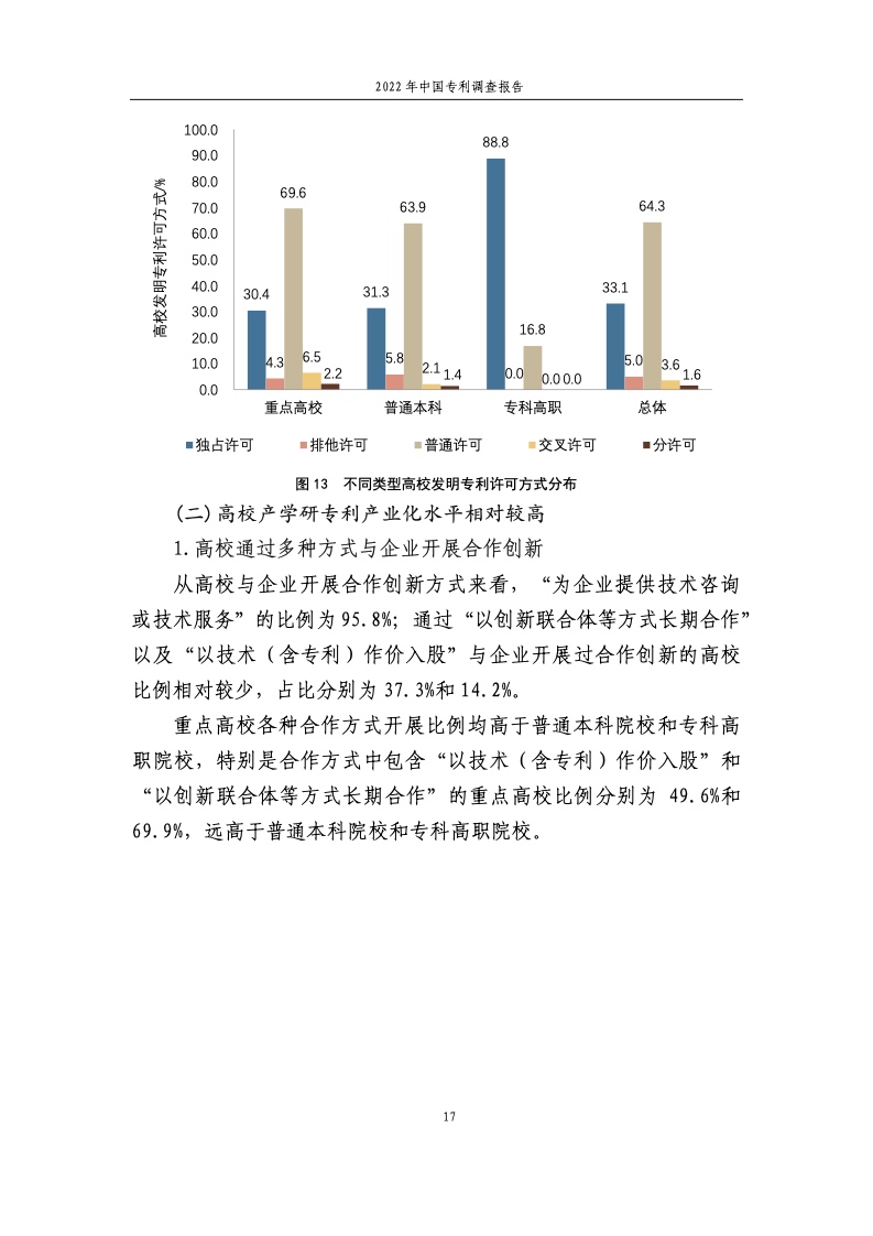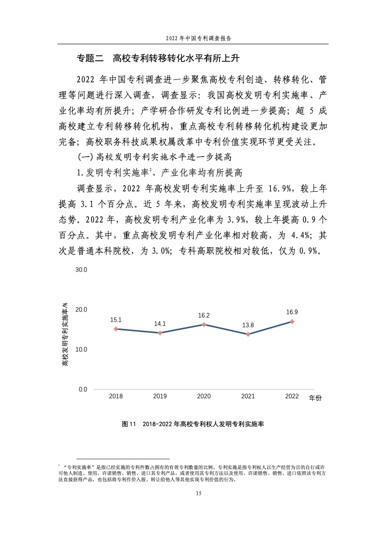 2022年,我国高校有效发明专利实施率为16.9%,较上年提高3.1个百分点。高校发明专利产业化率为3.9%,较上年提高0.9个百分点。高校发明专利许可率为7.9%,其中,普通许可是高校许可的主要方式,所占比重超过六成,达到64.3%。转移转化机构建设等措施有效促进了高校专利转移转化水平提升。