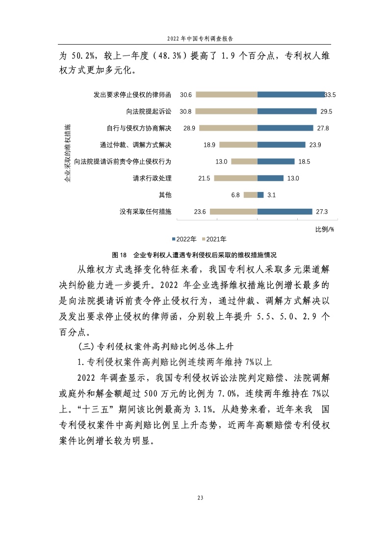 2022年,我国企业专利权人遭受专利侵权后采取维权措施的比例为72.7%,已连续四年保持在七成以上。企业专利权人在遭遇侵权后采取两种以上措施维权的比例为50.2%,较上一年度提高了1.9个百分点,表明我国企业专利维权能力整体进一步提升。