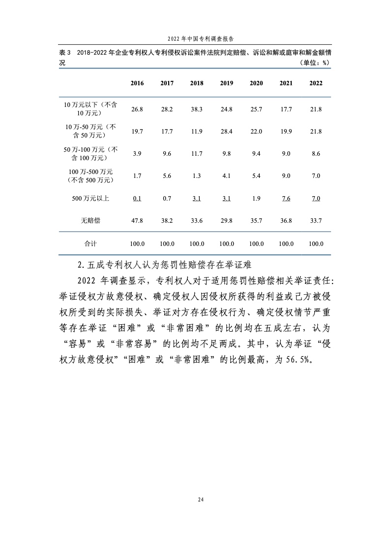 2022年,我国专利侵权诉讼法院判定赔偿、法院调解或庭外和解金额超过500万元的比例为7.0%,连续两年位于7%以上。比较来看,“十三五”期间该比例最高为3.1%。调查还显示,有45.3%专利权人了解专利侵权惩罚性赔偿制度,知识产权“严保护”理念更加深入人心。