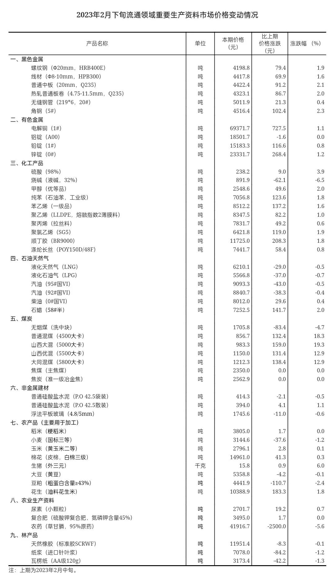 2023年2月下旬流通领域重要生产资料市场价格变动情况 据对全国流通领域9大类50种重要生产资料市场价格的监测显示,2023年2月下旬与2月中旬相比,30种产品价格上涨,15种下降,5种持平。 更多阅读:国家统计局:2023年4月下旬流通领域重要生产资料市场价格变动情况国家统计局:2022年10月下旬流通领域重要生产资料市场价格变动情况国家统计局:2023年5月下旬流通领域重要生产资料市场价格变动情况国家统计局:2023年8月下旬流通领域重要生产资料市场价格变动情况国家统计局:2022年4月下旬流通领域重要生产资料市场价格变动情况中国人民银行:2019年第一季度城镇储户问卷调查报告商务部:2017年全年全国吸收外资情况中国统计局:2018年1-8月份全国规模以上工业企业利润增长16.2%国家统计局:2024年1—5月份全国固定资产投资增长4.0%国家统计局:2024年5月中国采购经理指数运行情况中国人民银行:2023年二季度末金融业机构总资产449.21万亿元国家统计局:2024年6月份工业生产者出厂价格同比降幅继续收窄国家统计局:2024年1—6月份全国固定资产投资增长3.9%国家统计局:2024年1—5月份全国规模以上工业企业利润增长3.4%深房中协:2024年6月3日-9日深圳二手房交易量