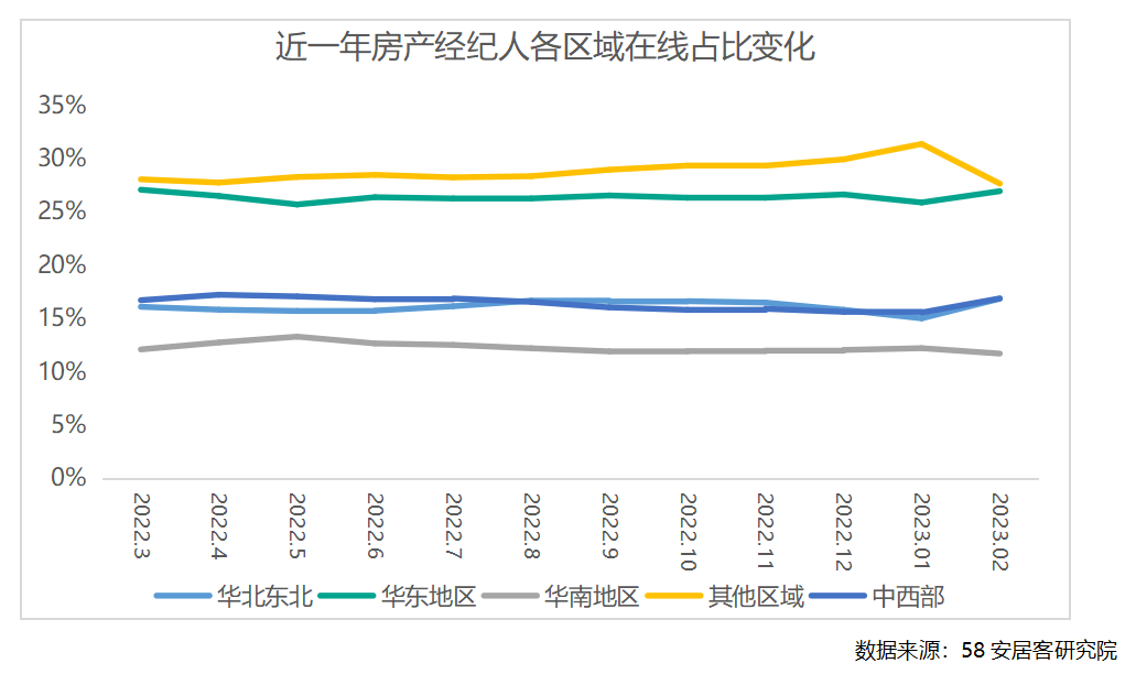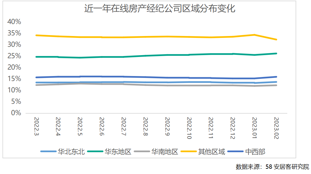 受2022年底房地产市场不景气影响,春节期间,不少发达地区房产中介提前关门放假或歇业,其他区域的影响则没有这么大,因此随着节后返工,其他区域的在线房产经纪公司占比显著减少。