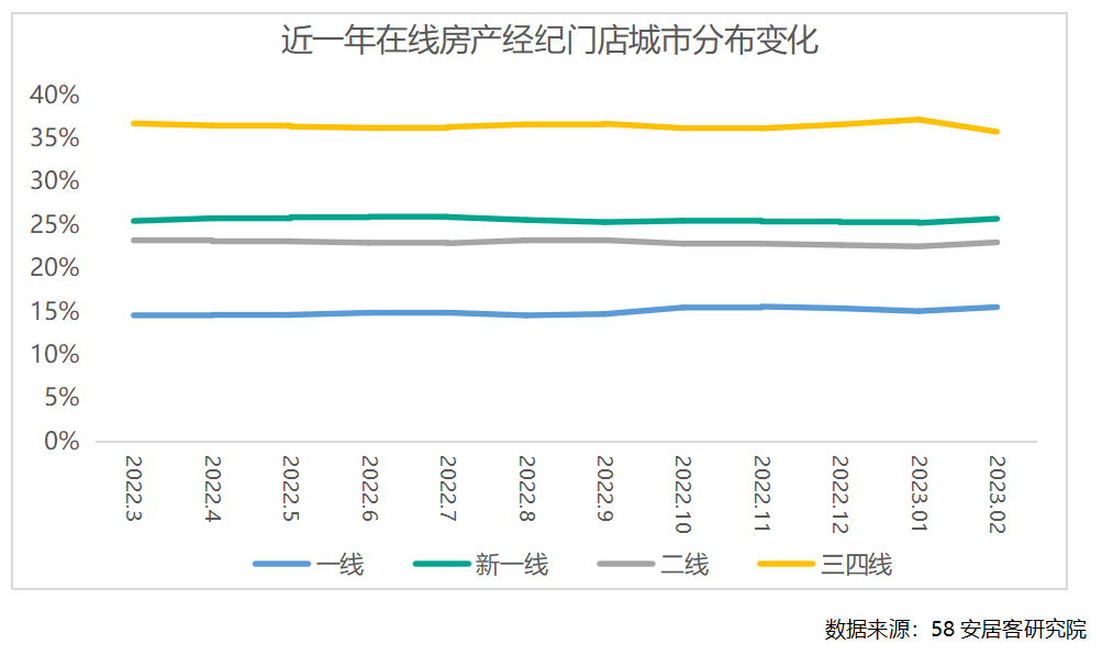 2月份,一线、新一线和二线城市经纪门店占比均提升约0.5%,相反三四线城市在线房产经纪门店占比减少约1.5%。随着假期的结束,叠加楼市利好政策,核心一二线城市房地产市场率先露出复苏迹象,随之也激发出城市经纪门店的活力。
