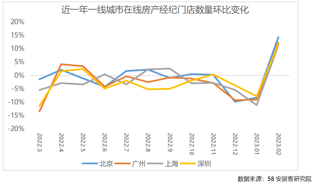 2023年2月,四个一线城市在线经纪公司数量均大幅增长,涨幅在15%到20%之间,这一方面是受到节后返工影响,另一方面也受楼市回暖的影响。一线城市基本面良好,需求仍然存在,楼市逐渐复苏,行业也有望迎来“阳春”。