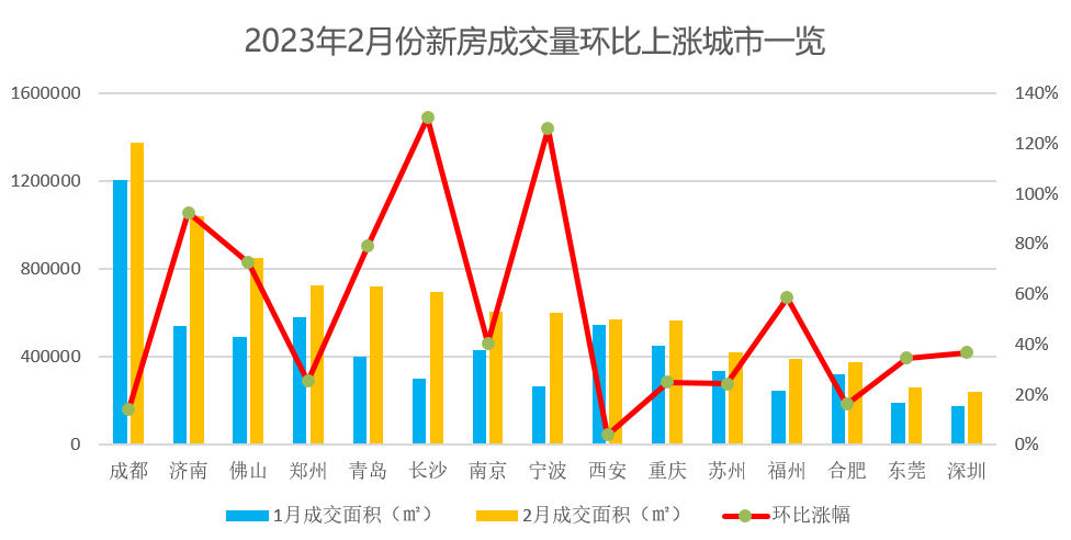 这些城市包括:成都、重庆、深圳、郑州、苏州、南京、西安、长沙、济南、青岛、福州、佛山、合肥、宁波、东莞等。其中,长沙和宁波2月份成交量相比1月份的增量最为明显,环比涨幅分别达130.38%和125.88%。