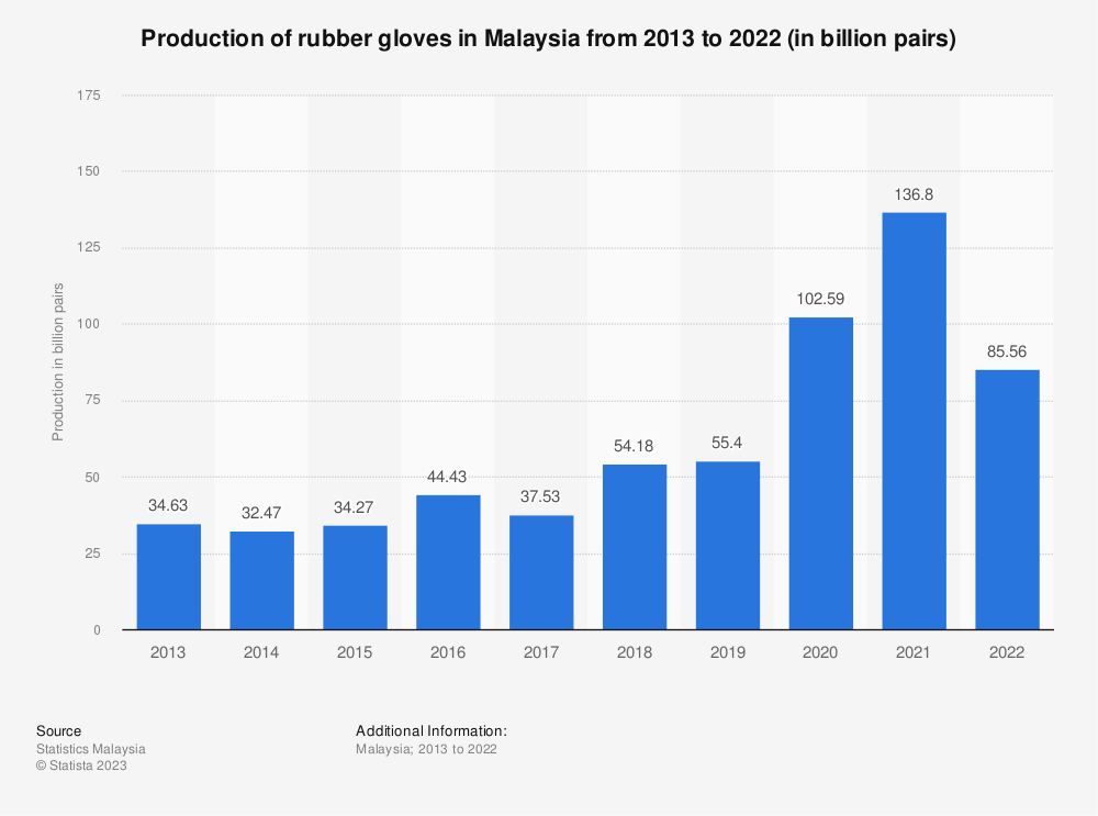 疫情刚开始时,马来西亚橡胶手套的产量几乎翻了一番,在疫情期间,橡胶手套的需求不断增加。直到2022年,由于大多数国家的疫情趋于稳定,橡胶手套的产量才略有下降。2022年,马来西亚生产了超过850亿双橡胶手套,与前一年生产的约1360亿双相比有所下降。
