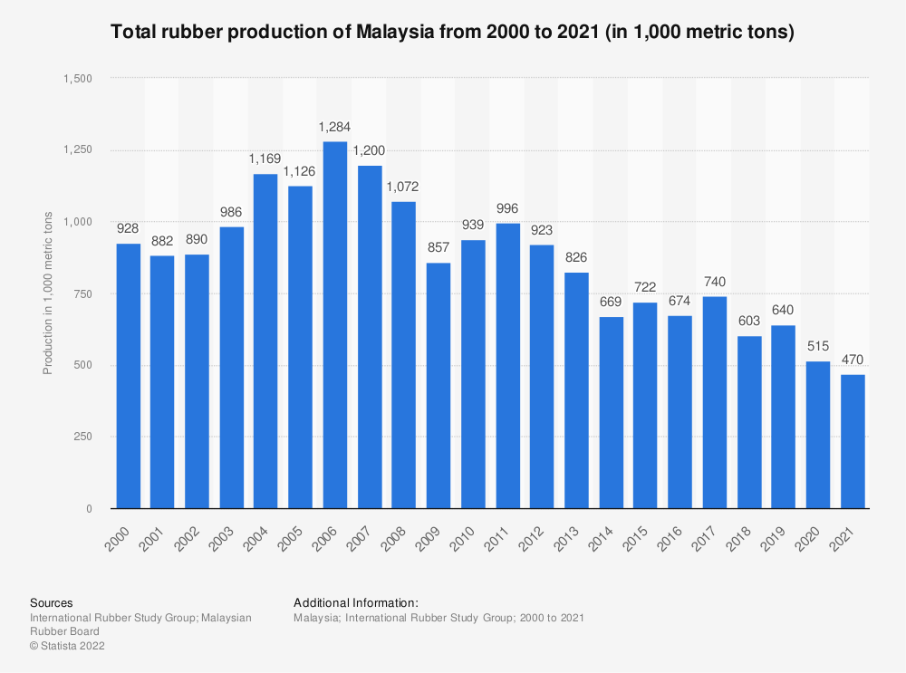 在过去的几年里,马来西亚的橡胶产量一直在下降,因为该国无法再与泰国等大型橡胶生产国竞争。然而,COVID-19大流行为该国橡胶制造业带来了新的机遇。自2020年以来,对橡胶手套等个人防护设备的需求一直在增加。2021年,马来西亚橡胶总产量约为47万吨。马来西亚是世界上主要的橡胶和橡胶制品生产国之一。