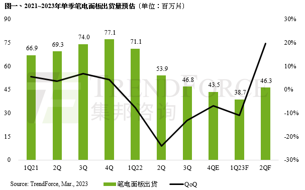 近日消息,TrendForce 集邦咨询最新报告显示,受到工作天数较少,以及品牌为去化库存调降订单影响,2023 年第一季度笔电面板出货预估为 3870 万片,环比衰退 10.4%,同比衰退 45.6%。
