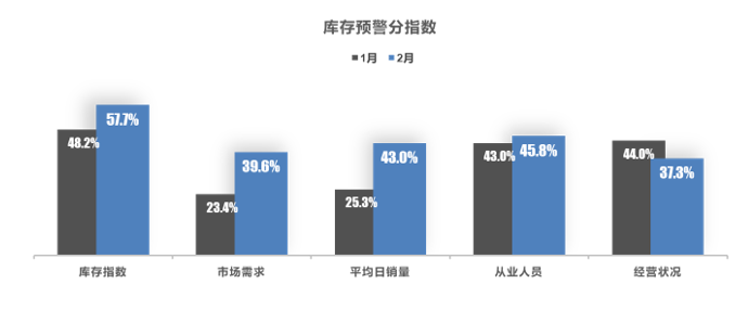 从分指数情况看:2月库存、市场需求、平均日销量、从业人员指数环比上升、经营状况指数环比下降。2月汽车生产端有所恢复,经销商补库动力强;由于市场竞争激烈,多家车企降价销售,经销商经营状况下滑。