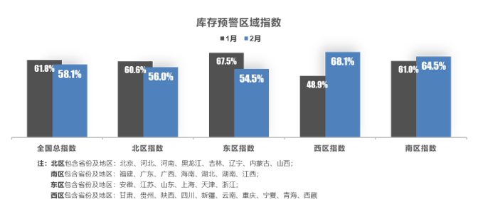 从区域指数情况看:2月全国总指数为58.1%,北区指数为56.0%,东区指数为54.5%,西区指数为68.1%,南区指数为64.5%。