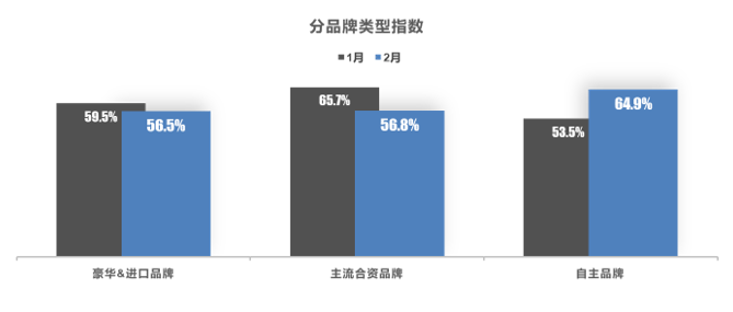 从分品牌类型指数看:2月进口&豪华品牌、合资品牌指数环比下降,自主品牌指数环比上升。