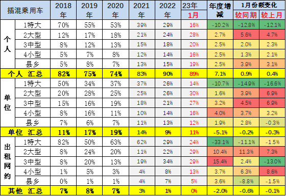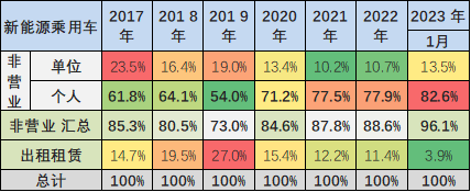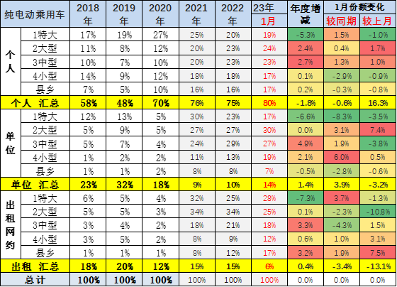 纯电动车的租赁市场目前表现逐步的回暖,2019年出租租赁占纯电动车销量处于峰值,随后2020年出租租赁的占比下降,2021-2022年表现下降到15%左右水平,2023年1月降到6%,透支明显。