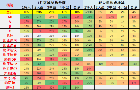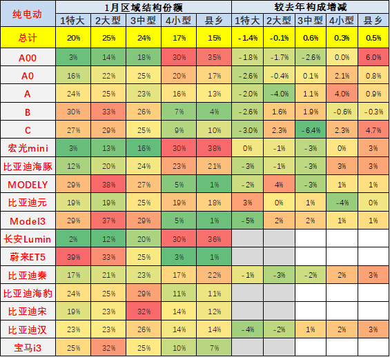 从主力车型的表现来看,也是体现了主力车型在大中城市的表现改善,尤其是1月以比亚迪为代表的增量,相比较同期的份额增量是大城市和中型市场增长2-3个百分点。从特斯拉来看, 1月份较同期的的主力区域更延伸到小型城市,大型城市的纯电动市场增长相对较好。