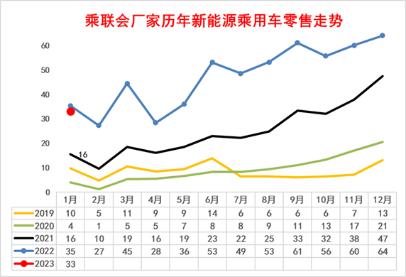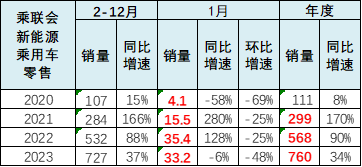 1月新能源乘用车国内零售33.2万辆,同比下降6%。这是近几年首次下降。