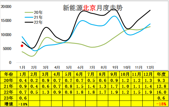 北京市场2022年新能源车市场走势相对较平稳,2022年的累计销量同比增长25%的表现一般。2023年1月销量达到0.6万台,稍低于去年同期。