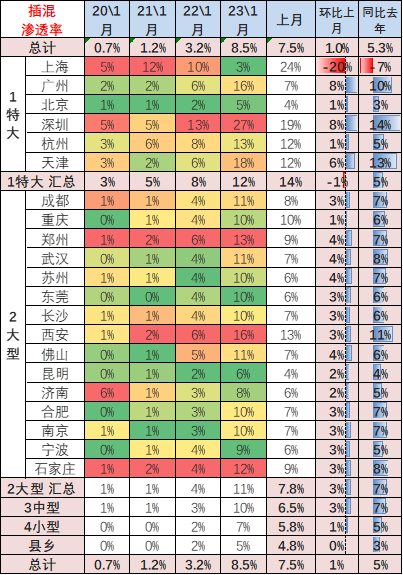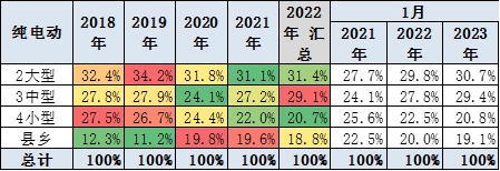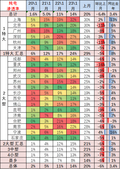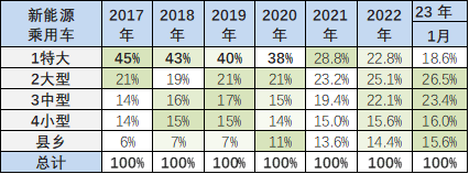 新能源乘用车前几年主要在限购特大城市需求较强,近期持续下行。2022年新能源乘用车在特大城市占到总销量23%,较2021年下降6个百分点,2023年1月继续下降。不限购城市的新能源车市场销量增速逐步放缓,基础的人口规模对需求有约束。由于人口基数大,公共交通差,近期的大中型城市市场需求旺盛,县乡市场新能源逐步启动。
