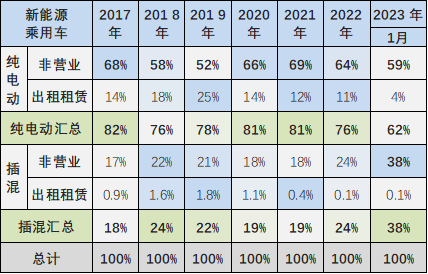 2017-2019年新能源乘用车的出租租赁类占比逐步提升,随后2020年开始的纯电动出租租赁的占比持续下降。今年的市场需求逐步走稳,纯电动2023年1月出租租赁的占比在4%,较去年稍有下降。