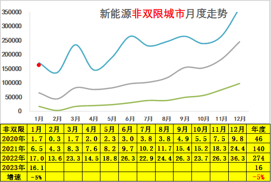2023年新能源车在非双限城市的表现一般, 1月份销售16万台降5%,1月增速放缓,走势较弱。