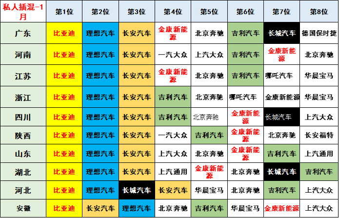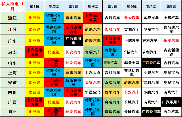 私人纯电动市场的特色相对鲜明,高端化趋势极其明显。比亚迪表现优秀,上海、浙江等发达地区基本都是第一。