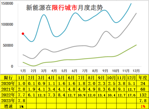 新能源车在限行城市的表现相对较强,2023年1月份仅达到7.8万台水平,同比增长速度达到1%的低水平。2022年新能源车的销量达到132万的水平,同比增长94%,远高于我们总体的车市增长,也高于我们总体新能源车的平均增长速度,体现了限行城市在疫情之下购买新能源车的热情相对较高。