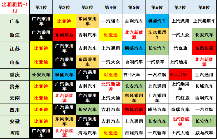 各地出租市场的表现相对差异化较大。今年1月表现较强的出租市场是广东、浙江、江苏等。其中各个厂家在各地的出租市场表现也是差异较大。有些地区的本地产品在本地出租市场的占有率并不一定很高,比如浙江市场今年都是外地品牌表现相对优秀。