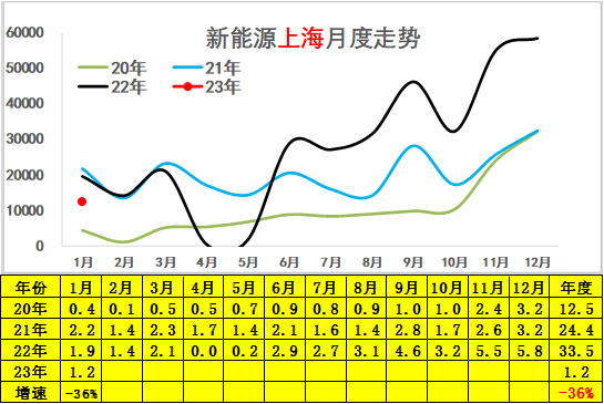 2023年1月份上海的新能源车市场销量达到1.2万台,相对去年1月的1.9万下降36%,抢牌照行情将逐步结束。