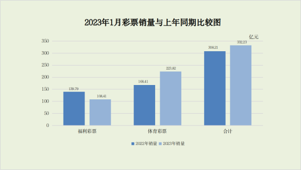 1月份,全国共销售彩票332.23亿元[1],同比增加24.02亿元,增长7.8%。其中,福利彩票机构销售108.41亿元,同比减少31.38亿元,下降22.4%;体育彩票机构销售223.82亿元,同比增加55.41亿元,增长32.9%。主要原因是,彩票销量在春节休市期间有所下降[2],但同时,由于上年末世界杯足球赛影响,体育竞猜型彩票销量较上年同期增长显著。