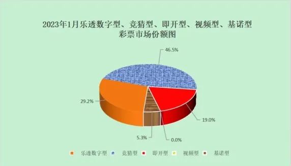 1月份,乐透数字型彩票销售96.83亿元,同比减少31.82亿元,下降24.7%;竞猜型彩票销售154.55亿元,同比增加72.11亿元,增长87.5%;即开型彩票销售63.11亿元,同比减少13.42亿元,下降17.5%;基诺型彩票销售17.73亿元,同比减少2.85亿元,下降13.9%。1月份,乐透数字型、竞猜型、即开型、基诺型彩票销售量分别占彩票销售总量的29.2%、46.5%、19.0%、5.3%,视频型彩票销售量占比不到0.1%。