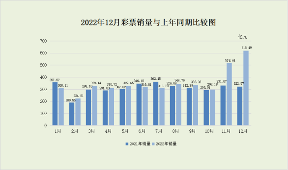 12月份,全国共销售彩票618.49亿元*,同比增加295.92亿元,增长91.7%。其中,福利彩票机构销售118.31亿元,同比减少24.03亿元,下降16.9%;体育彩票机构销售500.18亿元,同比增加319.95亿元,增长177.5%,主要受足球世界杯赛事拉动。