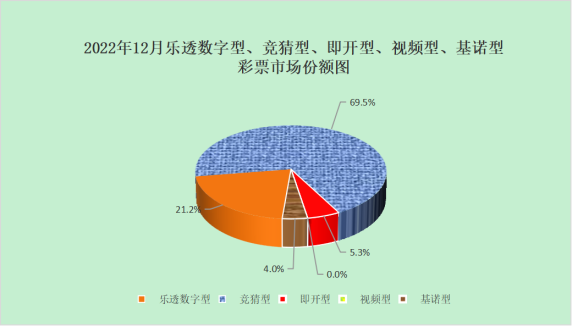 12月份,乐透数字型彩票销售131.07亿元,同比减少16.34亿元,下降11.1%;竞猜型彩票销售429.95亿元,同比增加333.66亿元,增长346.5%;即开型彩票销售32.52亿元,同比减少19.38亿元,下降37.3%;基诺型彩票销售24.95亿元,同比减少2.03亿元,下降7.5%。12月份,乐透数字型、竞猜型、即开型、基诺型彩票销售量分别占彩票销售总量的21.2%、69.5%、5.3%、4.0%。视频型彩票销售0.0002亿元,同比减少0.0007亿元。
