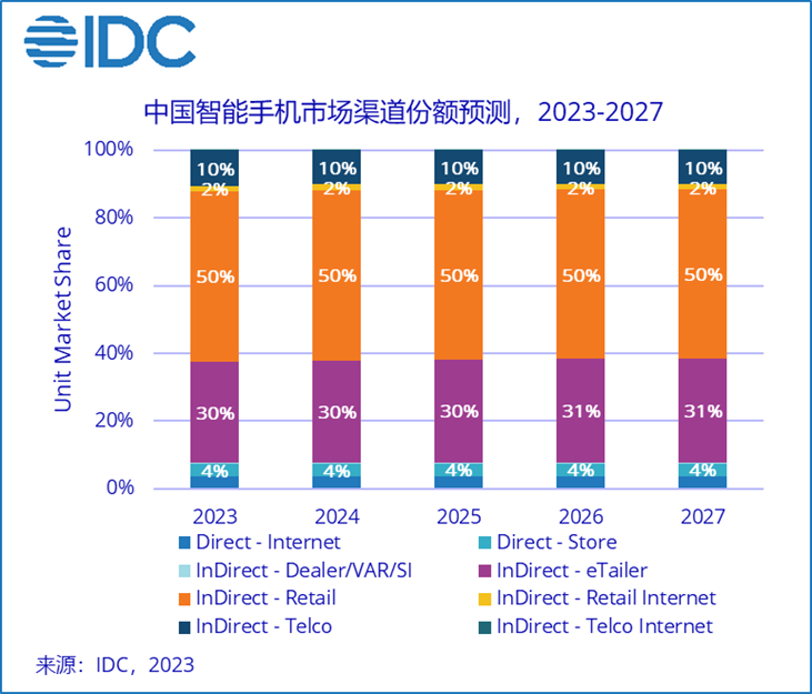 疫情三年,推动中国消费者的消费习惯继续向线上迁移。而直播带货的持续快速发展以及短视频平台切入电商赛道,推动了线上渠道份额的增长。IDC数据显示,中国智能手机市场线上渠道份额由2021年的32%上升到2022年的35%。其中,以京东为代表的电商渠道,近年来发展迅速,尤其是在用户服务需求不断升级、品牌面临洗牌重开的大背景下,即时零售的崛起、全渠道的融合成为了行业新的增长突破点。而在即时零售这一赛道上,京东基于自身多年供应链服务体系,优先完成了正品保障,渠道资源和即时配送三项关键能力整合,通过优质体验在市场中占据独特优势。其他各电商巨头陆续加大投入,将加速电商从单一线上渠道向全渠道拓展。预计2023年中国智能手机市场线上渠道份额将会继续提升到36%,未来延续份额增长趋势。