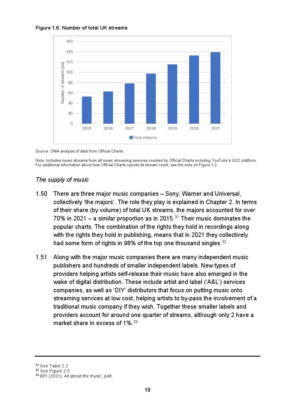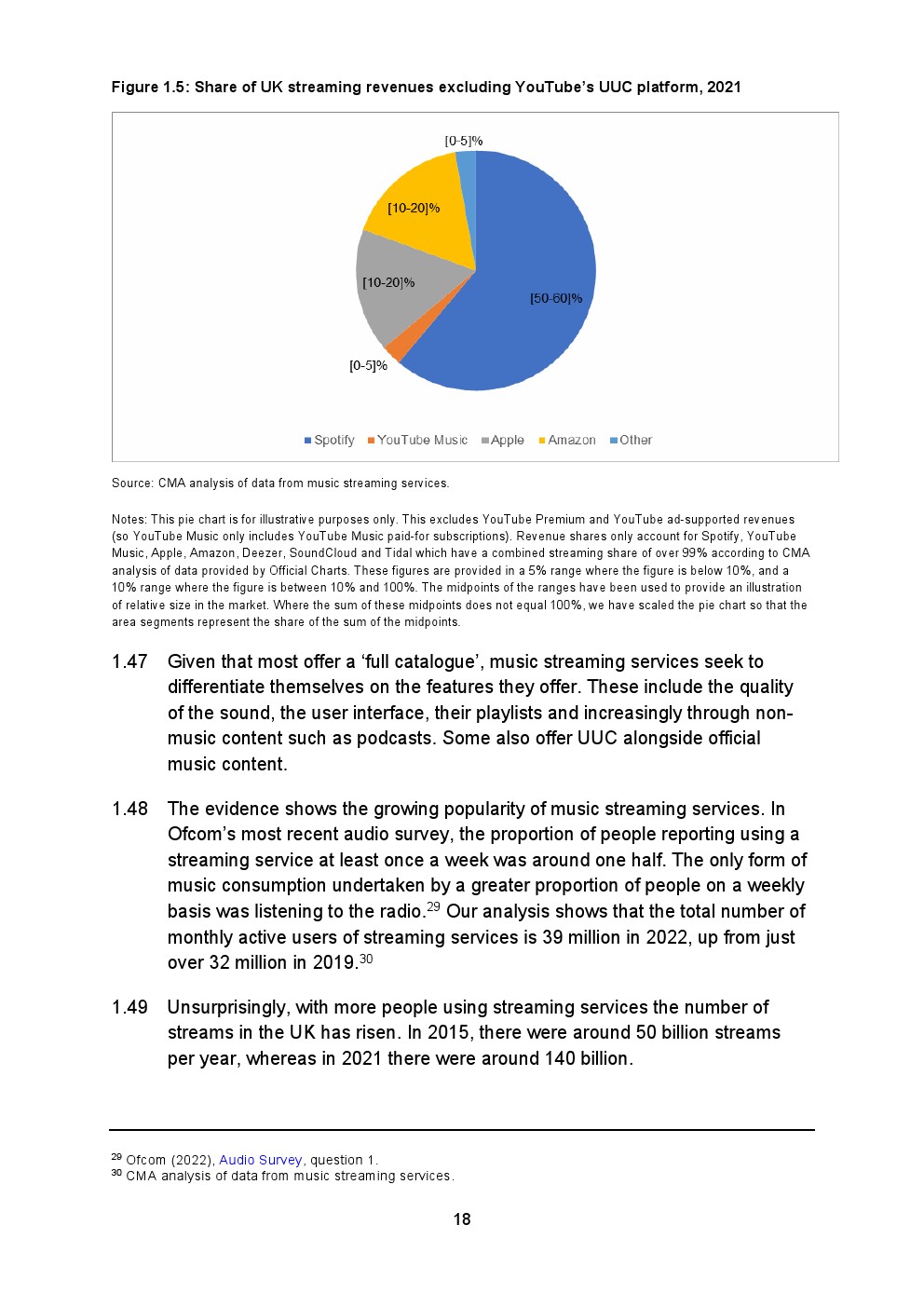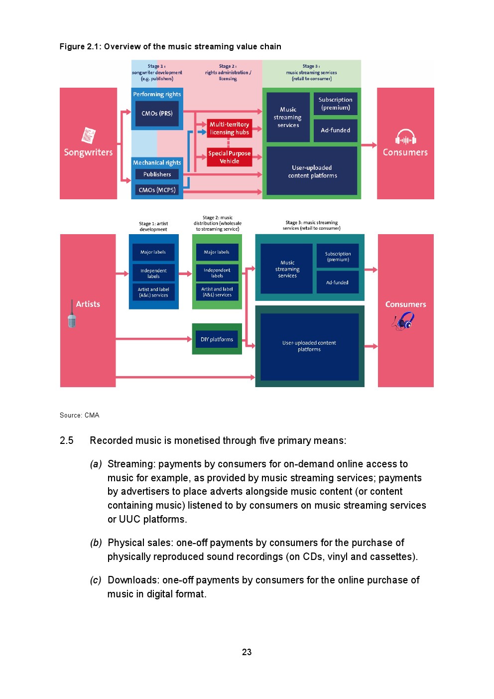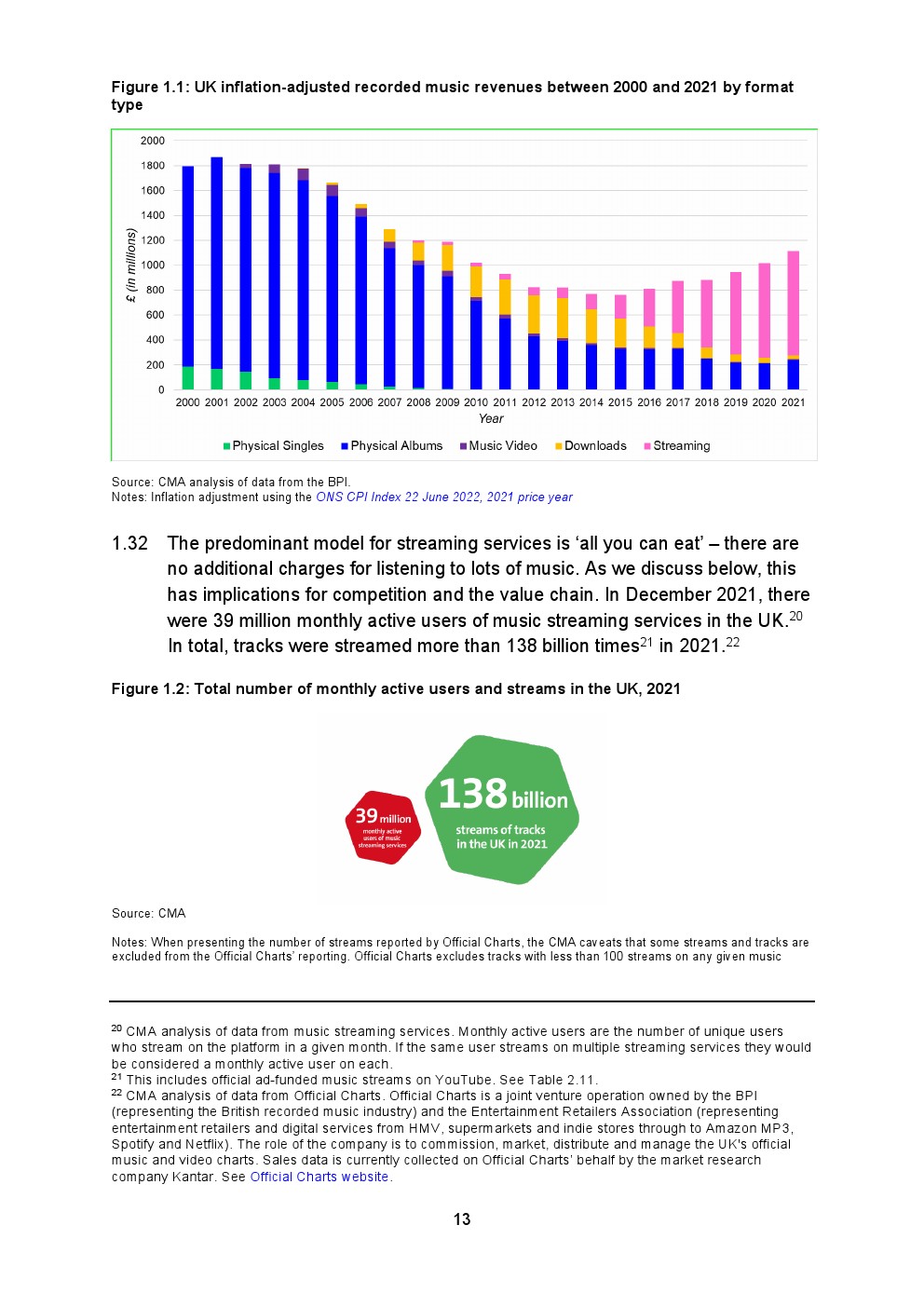 CMA发布了最新的“音乐和流媒体报告”。除了更广泛的文化和社会作用外,音乐还是英国经济的重要创意产业,2021 年为英国经济贡献 40 亿英镑,出口额为 25 亿英镑。