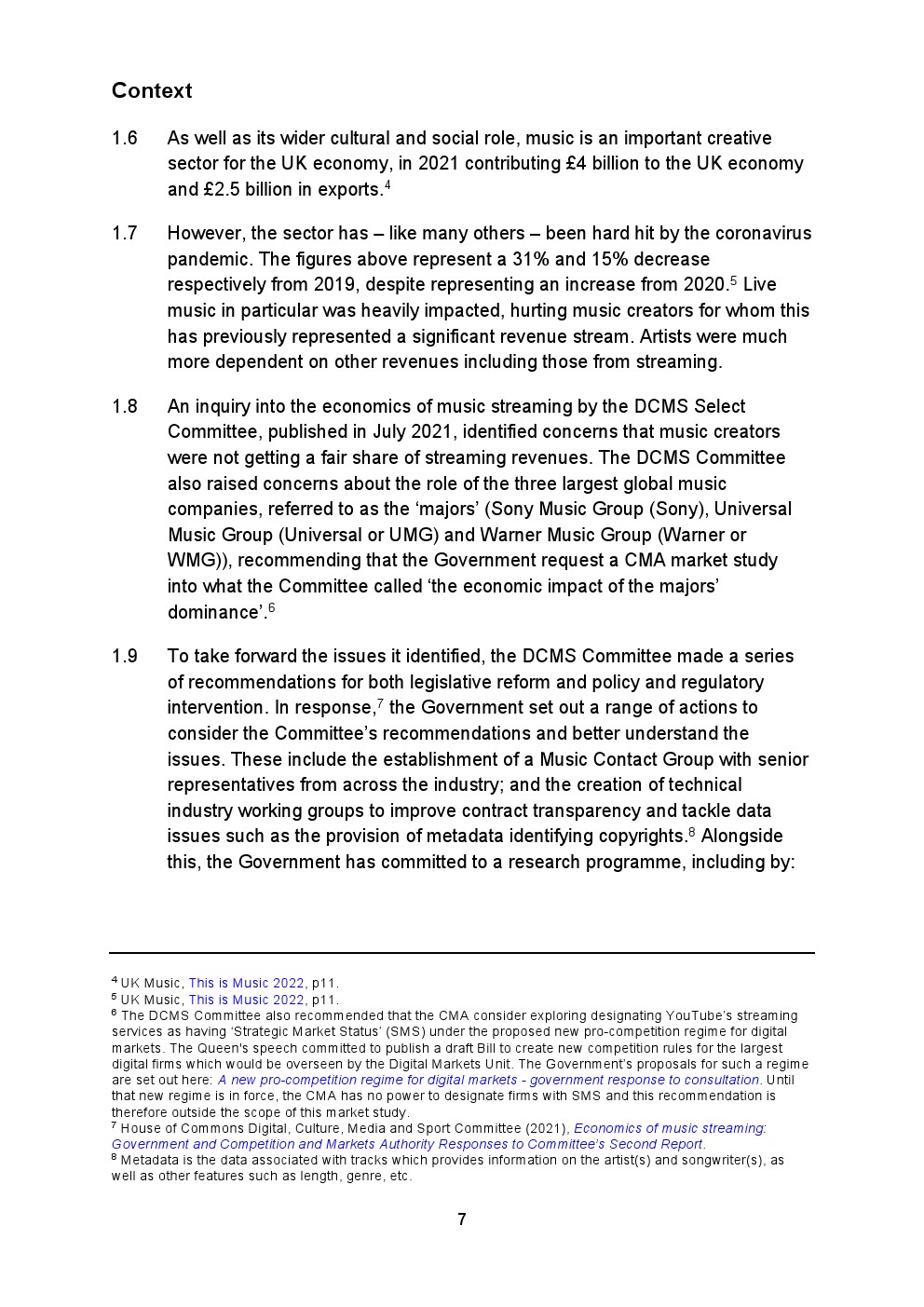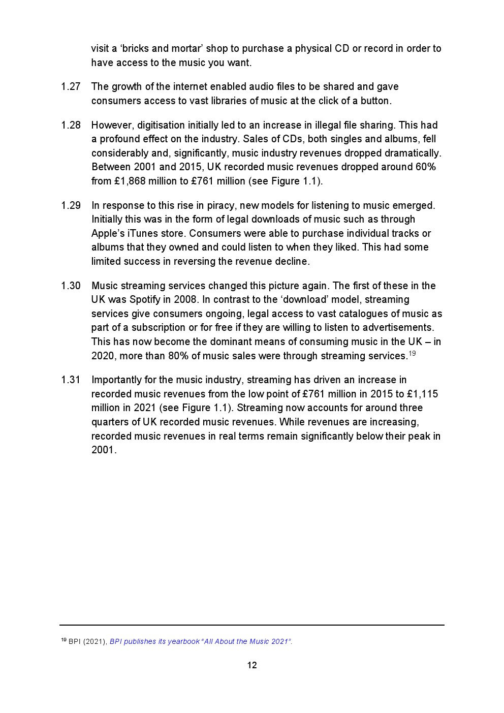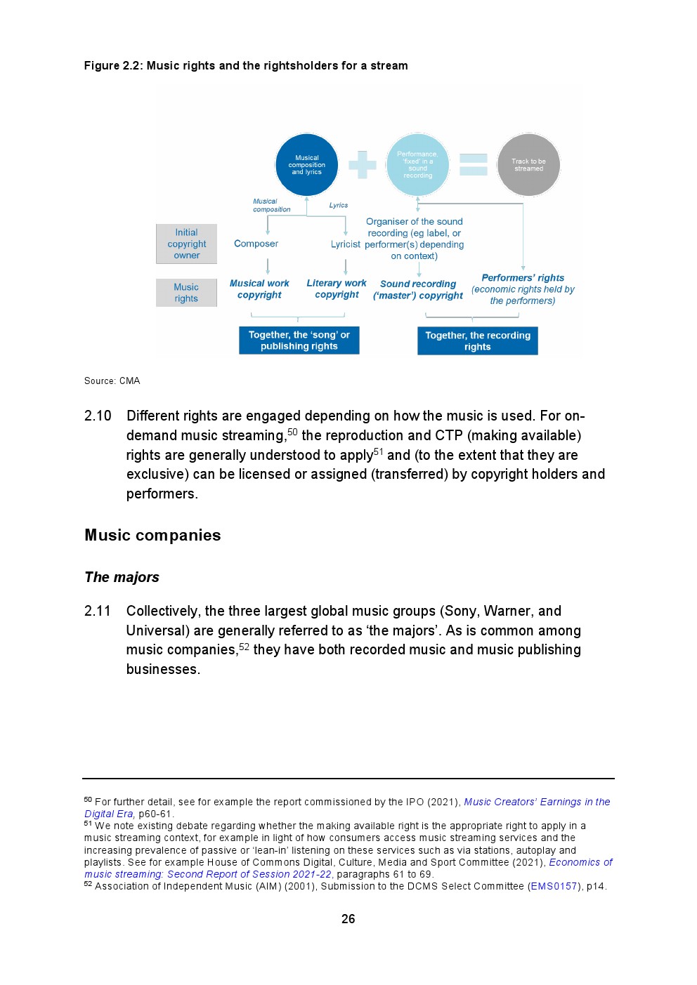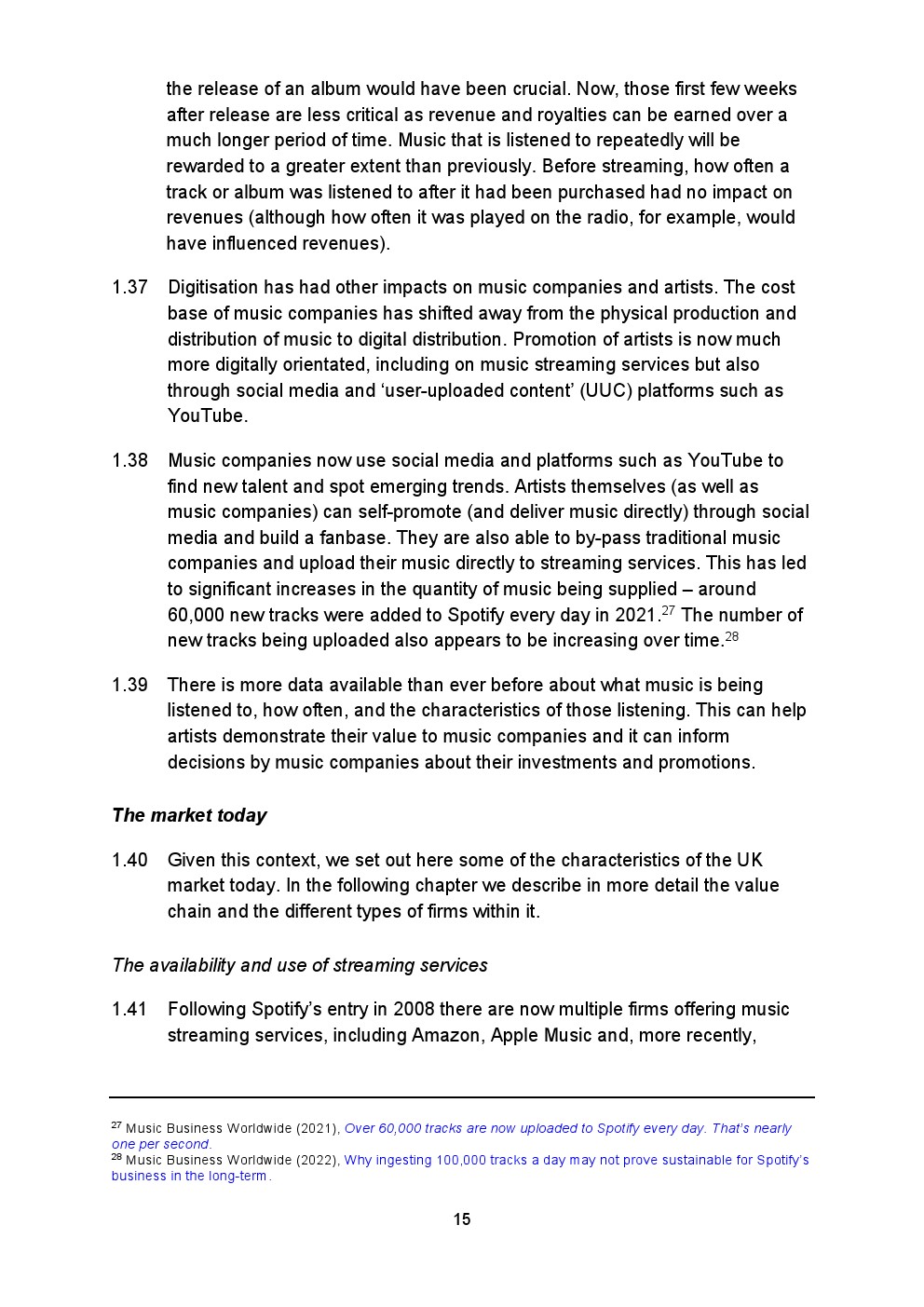 CMA发布了最新的“音乐和流媒体报告”。除了更广泛的文化和社会作用外,音乐还是英国经济的重要创意产业,2021 年为英国经济贡献 40 亿英镑,出口额为 25 亿英镑。